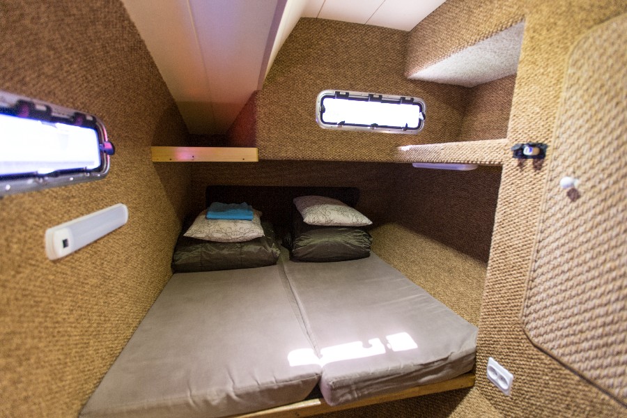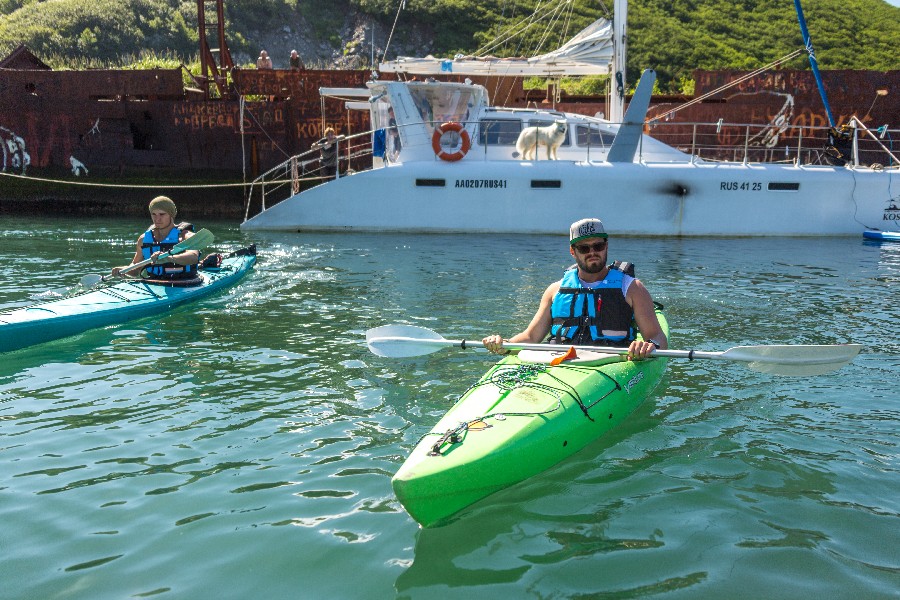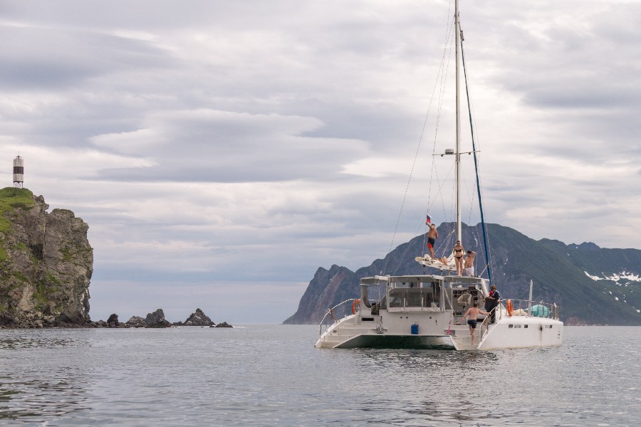 Парусно-моторный катамаран KOSATKA — лучший вариант для круиза, который мы нашли на Камчатке. Судно длиной пятнадцать метров, шириной восемь, подходит для прогулок по Авачинской бухте и для выхода в океан. На катамаране пять кают, три — двухместные, две — трехместные. Максимум на борту может разместиться двенадцать пассажиров.
