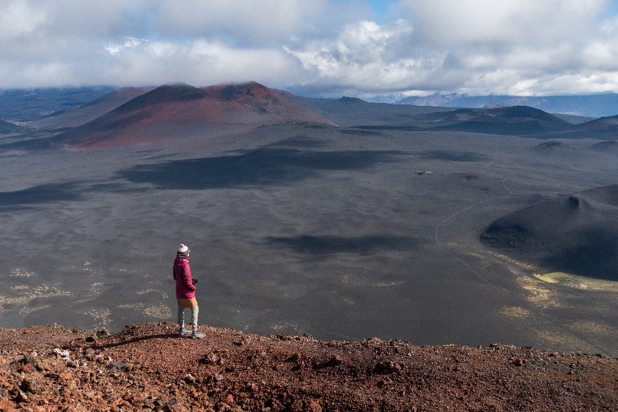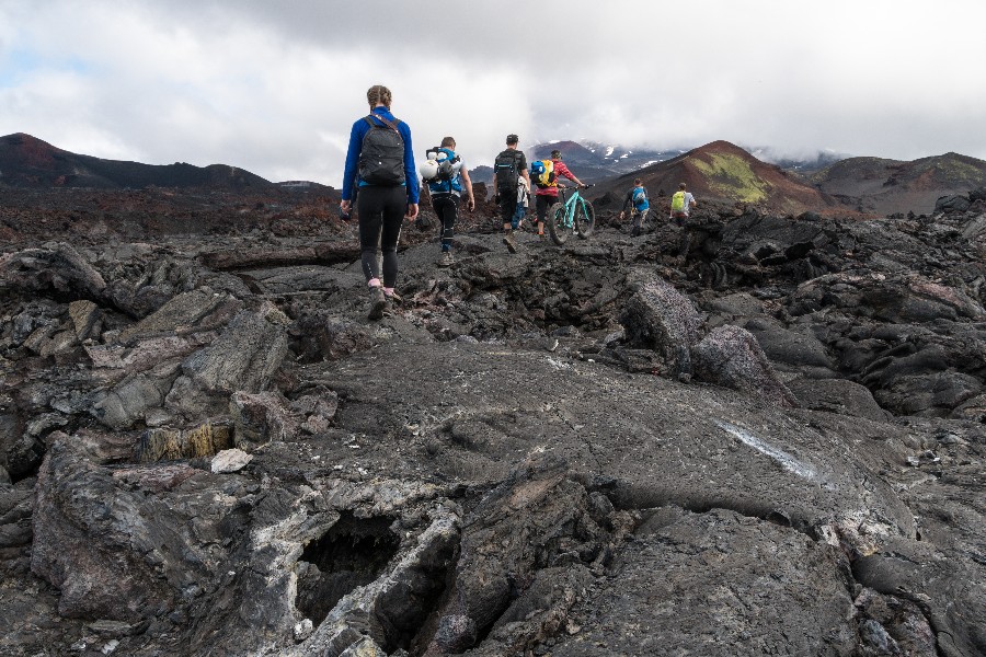 Мы поднимемся к конусу Клешня, где образовались глубокие трещины, из которых потом началось излияние жидкой лавы. Два потока прошли в сумме сорок километров, уничтожая все на своем пути. Застыв они образовали рельеф, ради которого сюда приезжают туристы со всего мира.