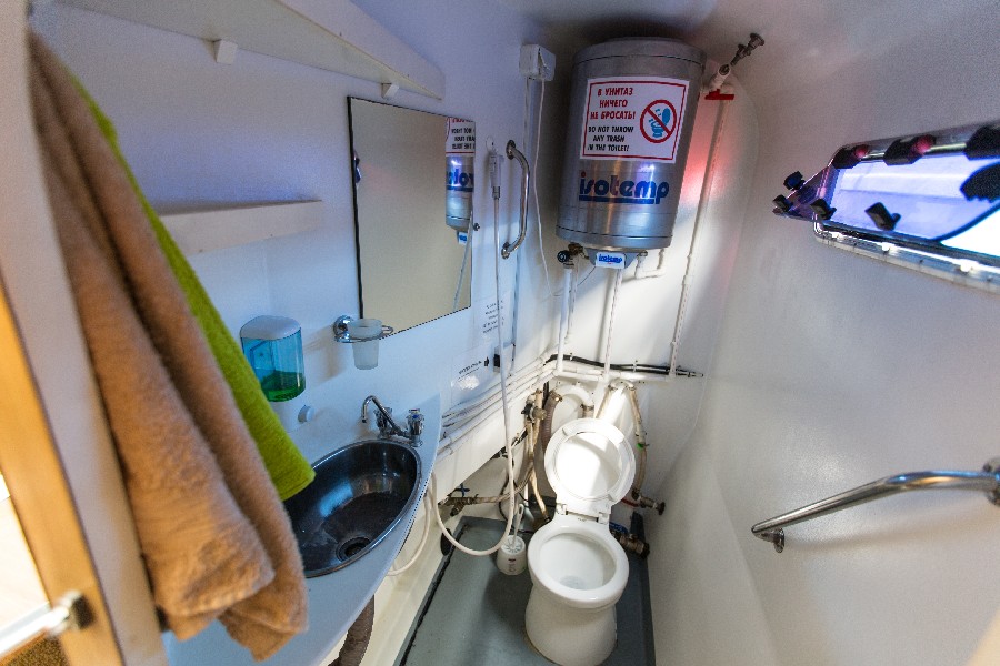 На все каюты два гальюна с унитазами, душевыми и раковинами. В отличие от яхтенных гальюнов, здесь они большей площади — размеры катамарана позволяют.