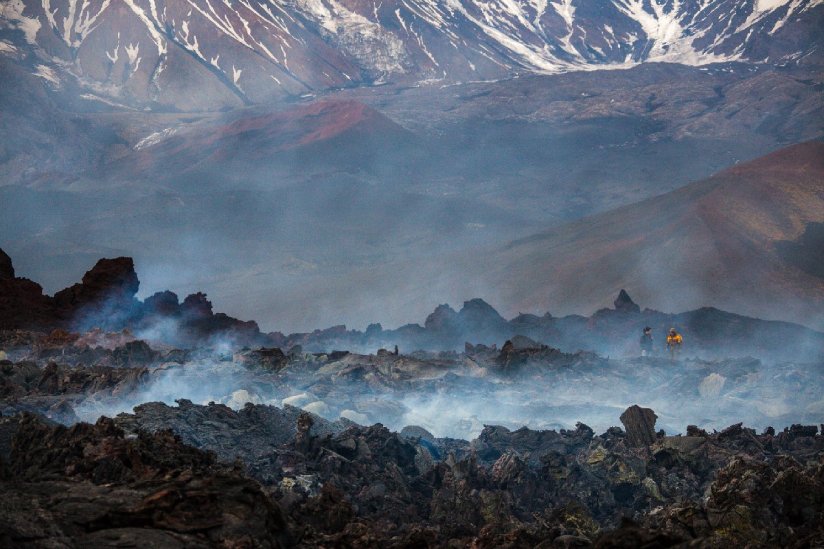 Толбачик — это массив из двух вулканов — Острого Толбачика и Плоского Толбачика. Первый потухший, второй — действующий. Расстояние от вулканов до столицы полуострова 350 километров. Добраться можно на машине или вертолетом. Фишка места — застывшие лавовые реки. В 2012 году здесь можно было увидеть движение вязкой раскаленной лавы и небольшие извержения с расстояния 10–20 метров. Из-за того, что это было относительно безопасно, местные их называли «туристические извержения».