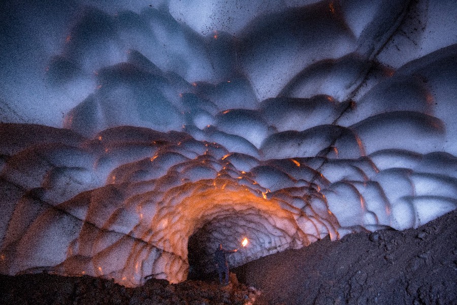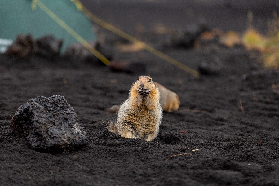 Фишки Мутновского вулкана — серные поля, парящие фумаролы, грязевые котлы, ледяные пещеры и водопад Опасный. Вокруг вулкана все кипит, бурлит, дымит — это одно из самых больших геотермальных месторождений в мире. Если повезет, то недалеко от кратера можно встретить и покормить печеньем тарбаганов — черношапочных сурков. Они здесь такие же местные жители, как и медведи.