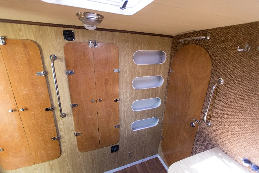 Осадка катамарана 140 сантиметров — это немного, можно подойти к скалам или останавливаться в бухтах, недоступных для других суден. Максимальная скорость движения 16 км/ч, что при достаточно приличных габаритах и особенностях конструкции катамарана делает качку минимальной. Те, у кого морская болезнь, будут страдать меньше или не почувствуют дискомфорта совсем.