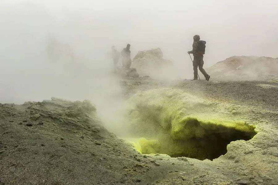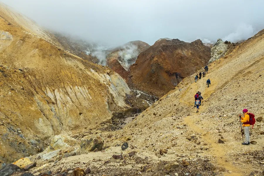 Восхождение на Мутновский не требует специальной физической подготовки и экипировки. Будет достаточно спортивного костюма, удобной обуви и треккинговых палок. Поход занимает шесть часов — это с пикником и привалами. Восхождение без проводника занятие небезопасное — вокруг фумарольные поля с кипятком, да и медведей никто не отменял. Вам переживать об этом не нужно, вы все достопримечательности посмотрите с вертолета.