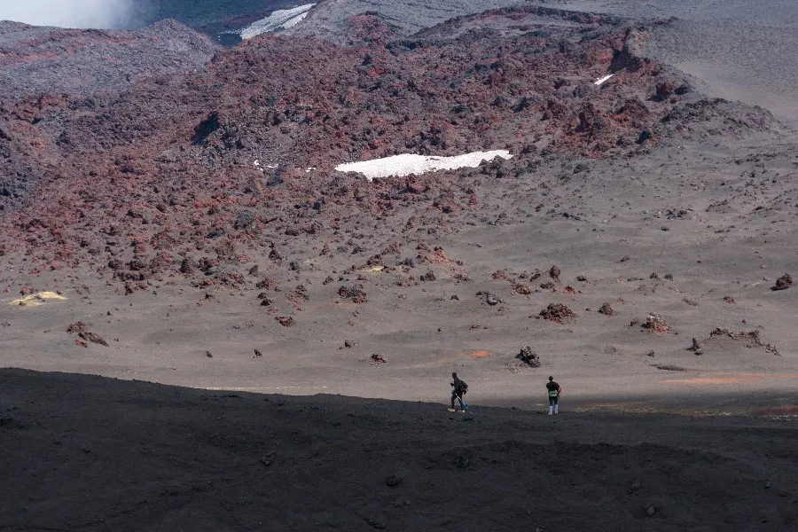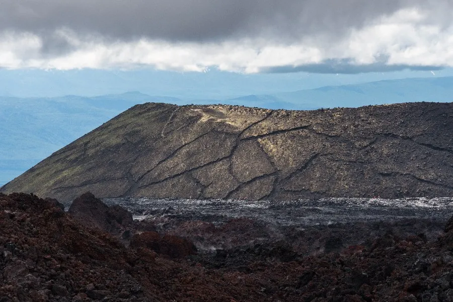 Мы поднимемся к конусу Клешня, где образовались глубокие трещины, из которых потом началось излияние жидкой лавы. Два потока прошли в сумме сорок километров, уничтожая все на своем пути. Застыв они образовали рельеф, ради которого сюда приезжают туристы со всего мира.
