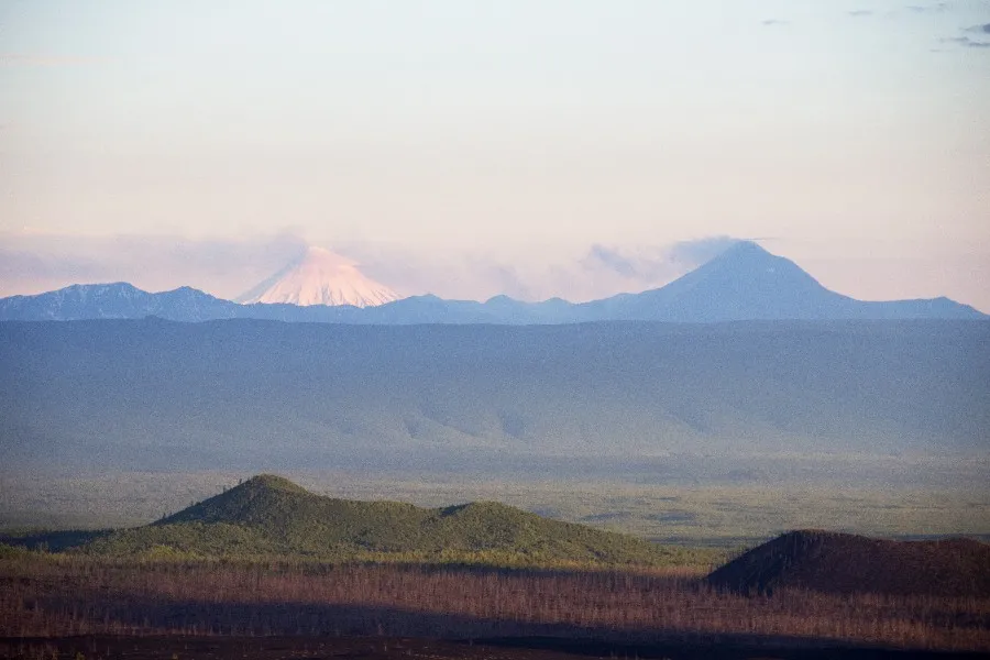 С вершины Плоского Толбачика открывается панорама на Долину Великанов — вулканы Острый Толбачик, Ушковский, Крестовский, Камень, Ключевская Сопка, Безымянный, Острая и Овальная Зимина, Малая и Большая Удина, Шиш и Горный Зуб.