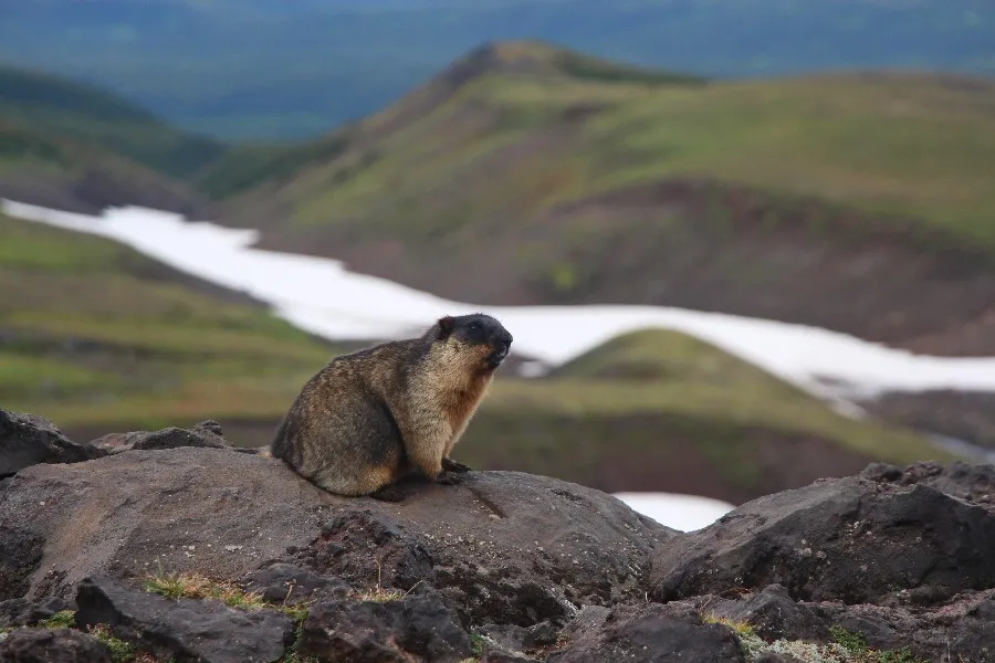 Фишки Мутновского вулкана — серные поля, парящие фумаролы, грязевые котлы, ледяные пещеры и водопад Опасный. Вокруг вулкана все кипит, бурлит, дымит — это одно из самых больших геотермальных месторождений в мире. Если повезет, то недалеко от кратера можно встретить и покормить печеньем тарбаганов — черношапочных сурков. Они здесь такие же местные жители, как и медведи.