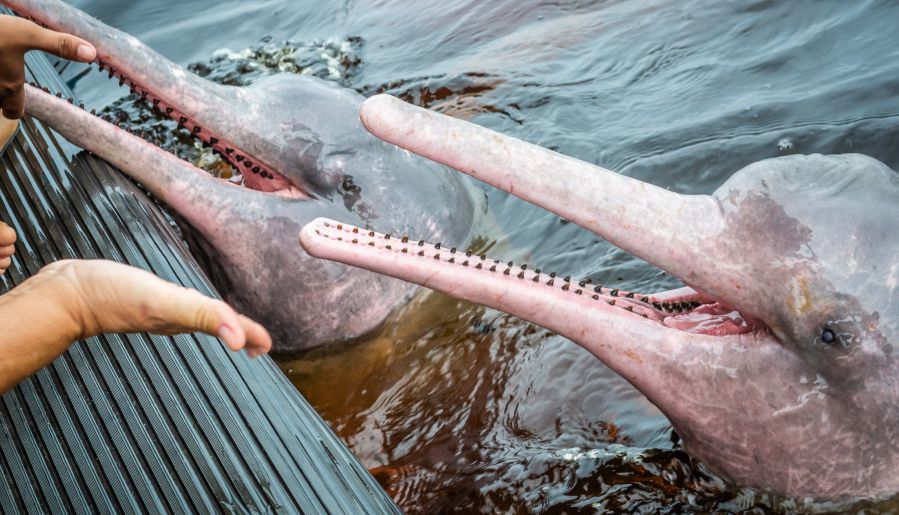 Во второй половине дня на мотоканоэ отправитесь на поиски удивительных животных — амазонских речных дельфинов. Рождаясь светло-серыми, по мере взросления они становятся розовыми. Во время поездки вы сможете покормить удивительных обитателей Амазонии и даже искупаться с ними.