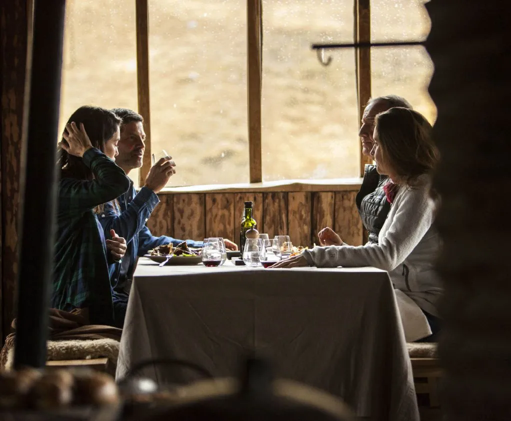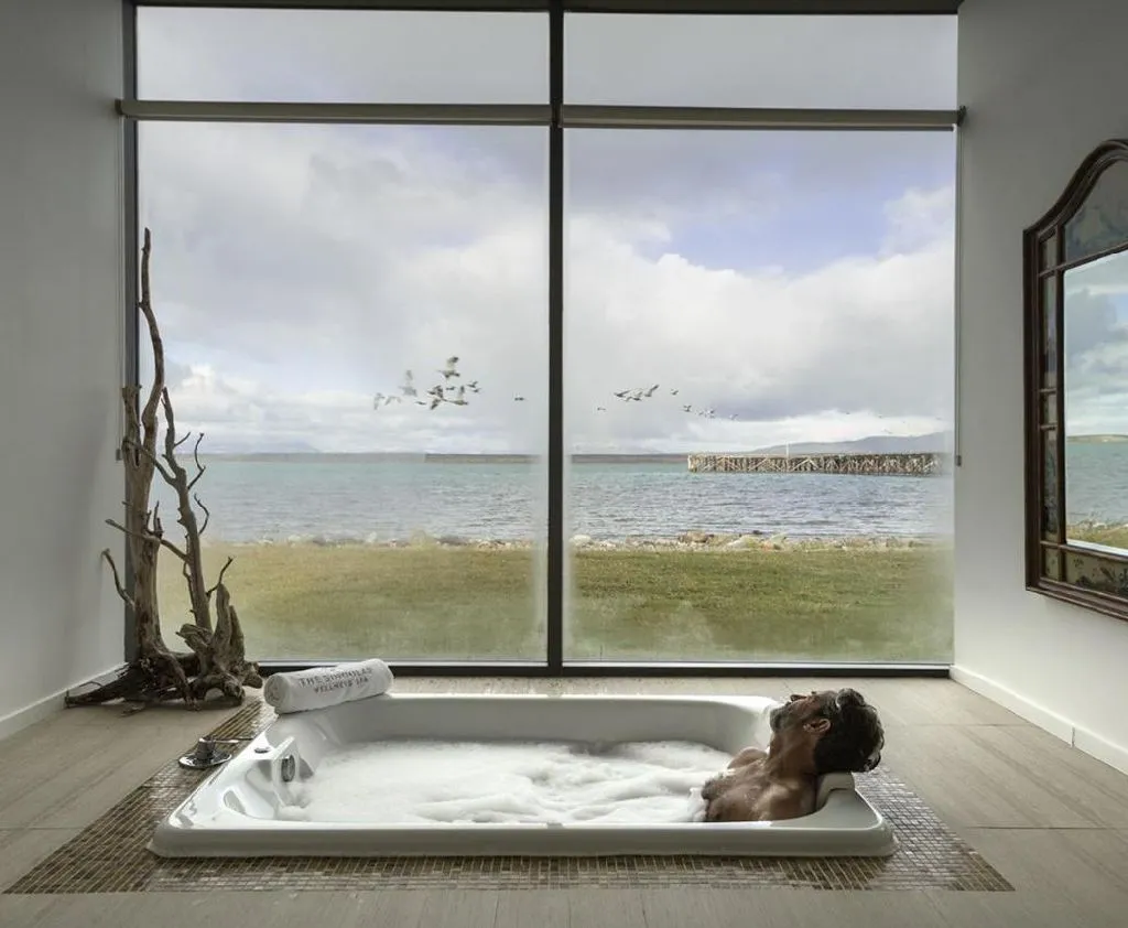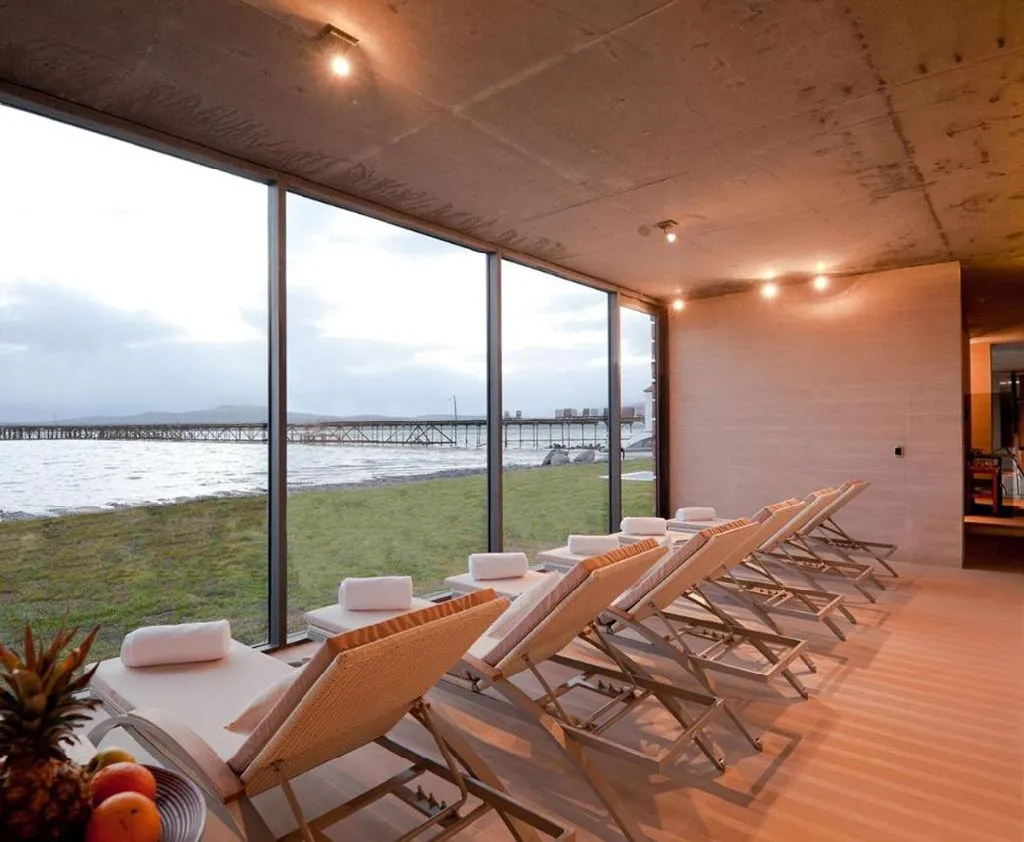 Из панорамных окон открывается вид на патагонский фьорд Ультима-Эсперанса и Анды. Каждое утро для всех гостей накрывают завтрак — каши, омлеты, кофе и соки.