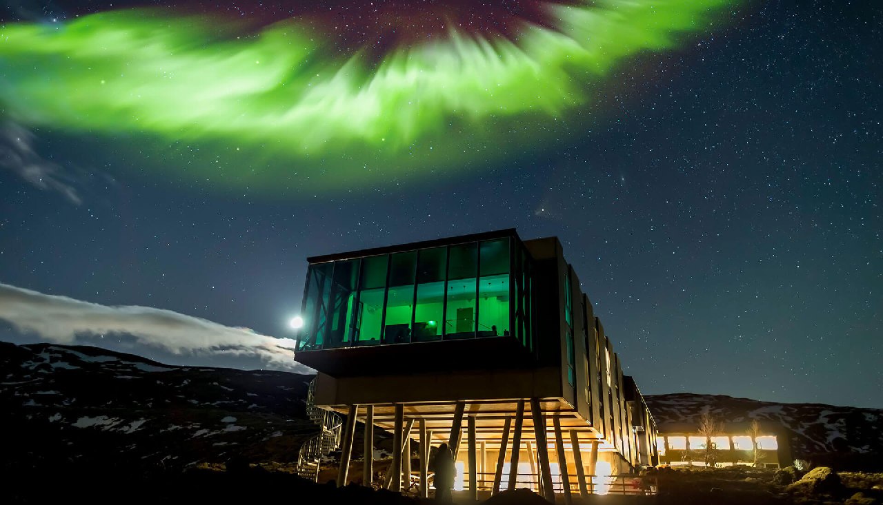 ION Luxury Adventure Hotel — урбанистический отель в часе езды от Рейкьявика. 46 номеров с панорамными окнами и высокими потолками, отапливаются за счет термальных источников. Все предметы интерьера сделаны из перерабатываемых материалов. Например, мебель — из обломков дерева, выброшенных океаном на берег, а элементы декора — из застывшей лавы и вулканического пепла.
