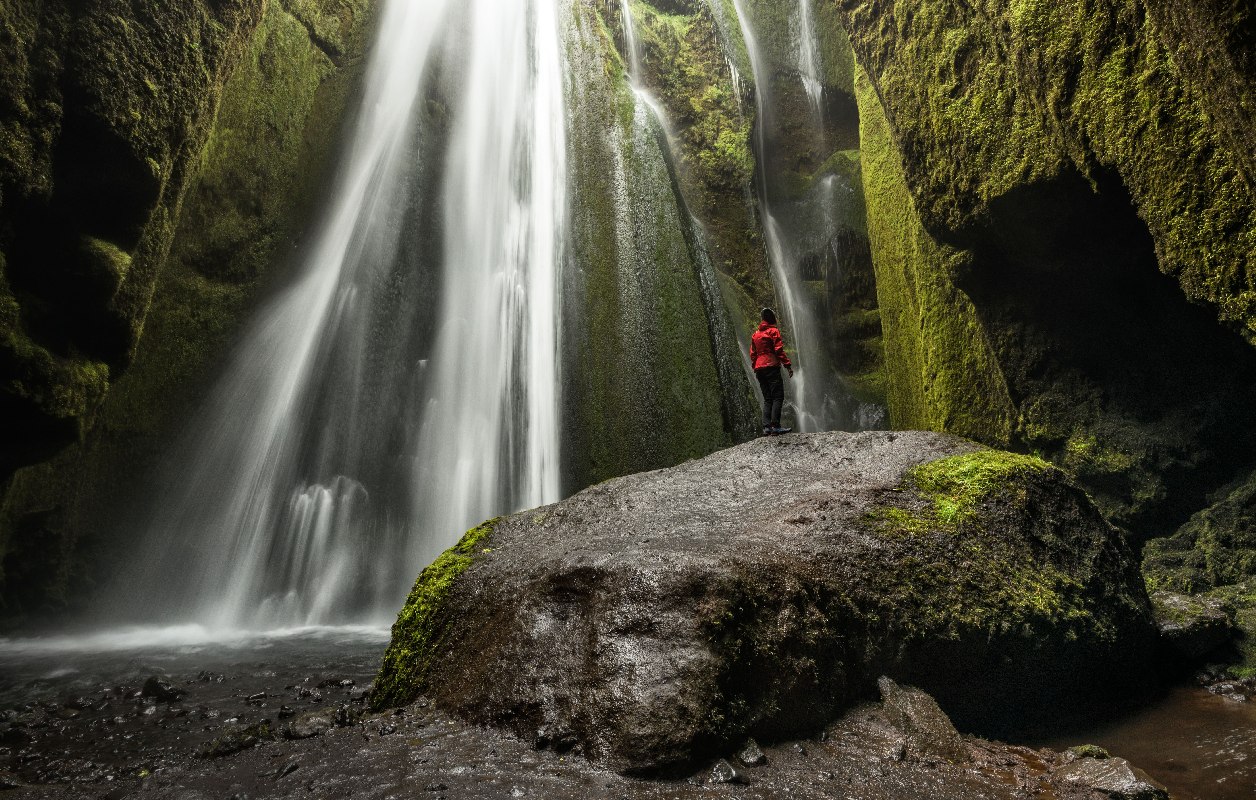 Сельяландсфосс — водопад, за которым можно спрятаться. В скале, за водным потоком, есть глубокая впадина, чтобы туда попасть необходимо подняться с автопарковки по лестнице.