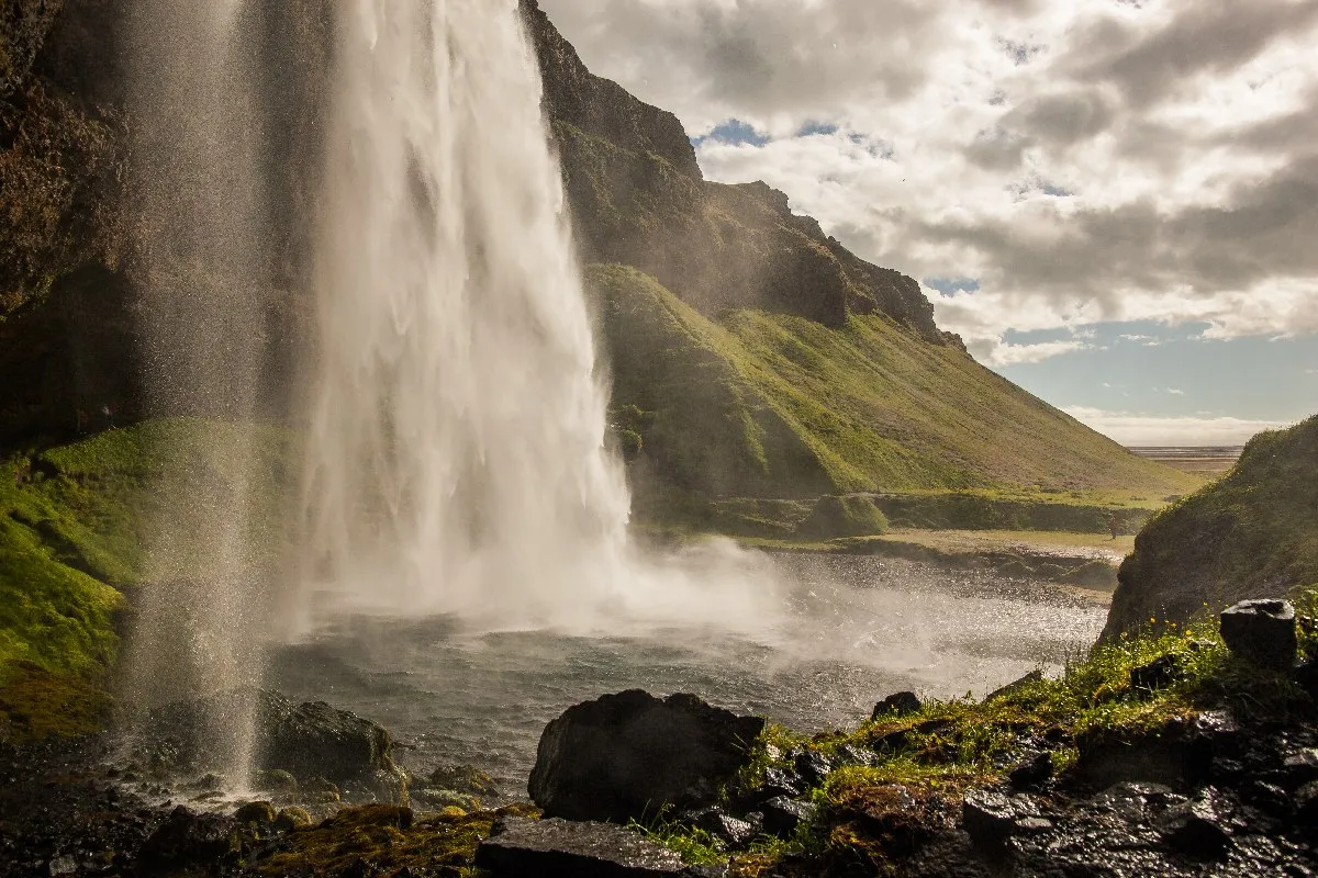 Сельяландсфосс — водопад, за которым можно спрятаться. В скале, за водным потоком, есть глубокая впадина, чтобы туда попасть необходимо подняться с автопарковки по лестнице.