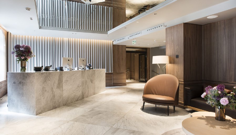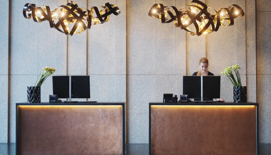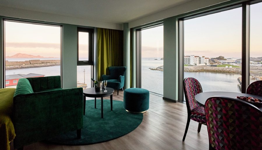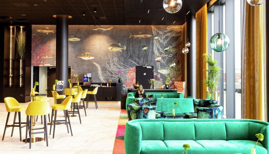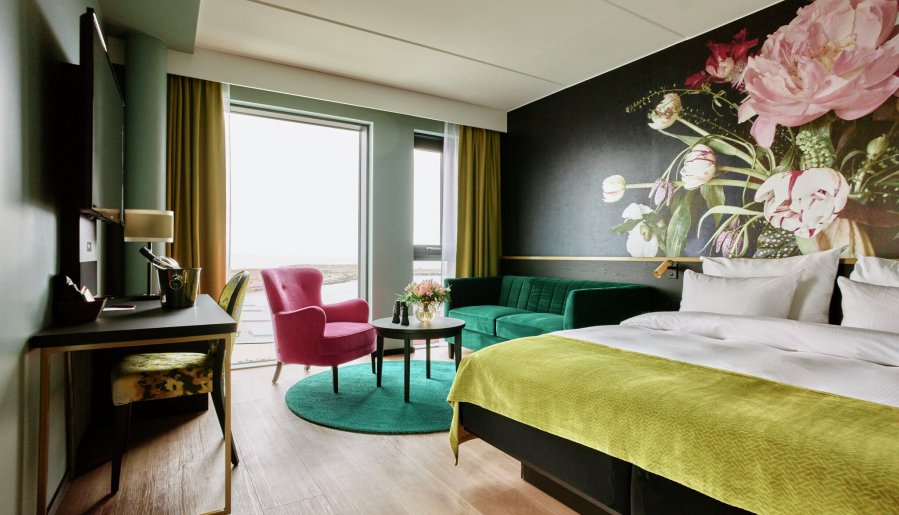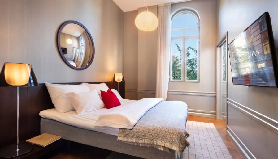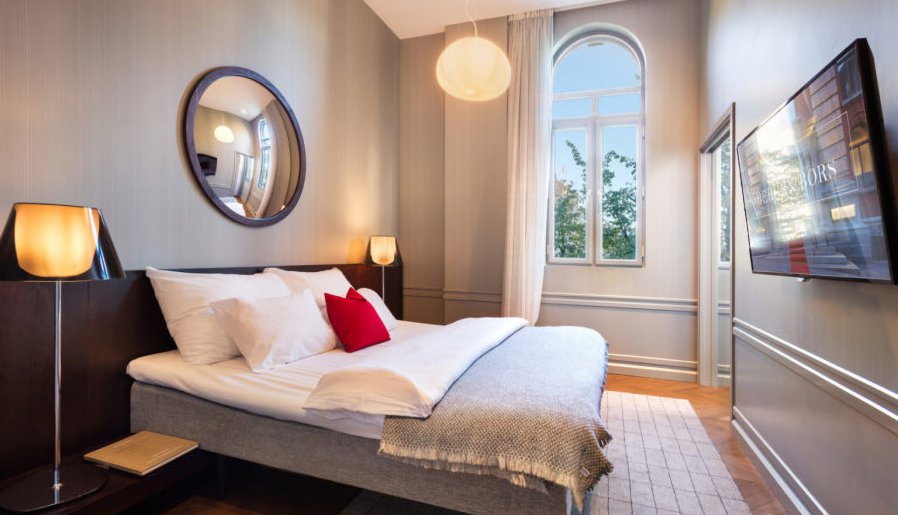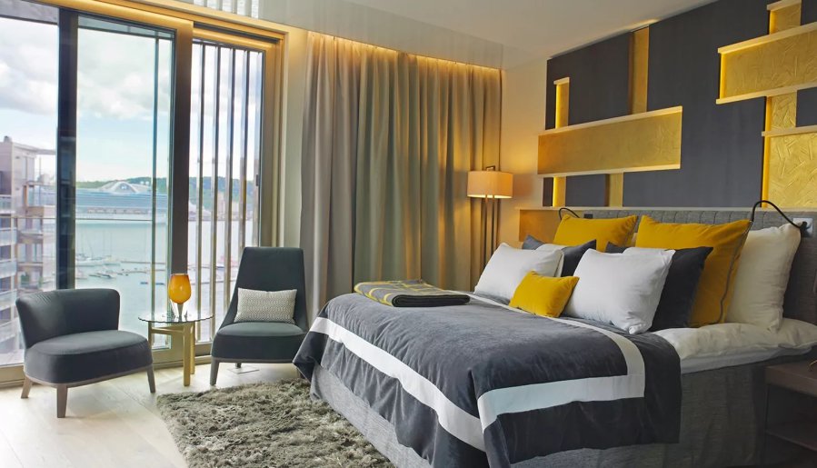Номера выполнены в темных тонах, что характерно для скандинавского дизайна. В каждой комнате есть окна в пол с видом на город или на набережную, стоит кофе-машина «Неспрессо», сейф, рабочий стол и мини-бар. Также в отеле есть фитнесс-зал, открытый 24 часа, ресторан и бар.