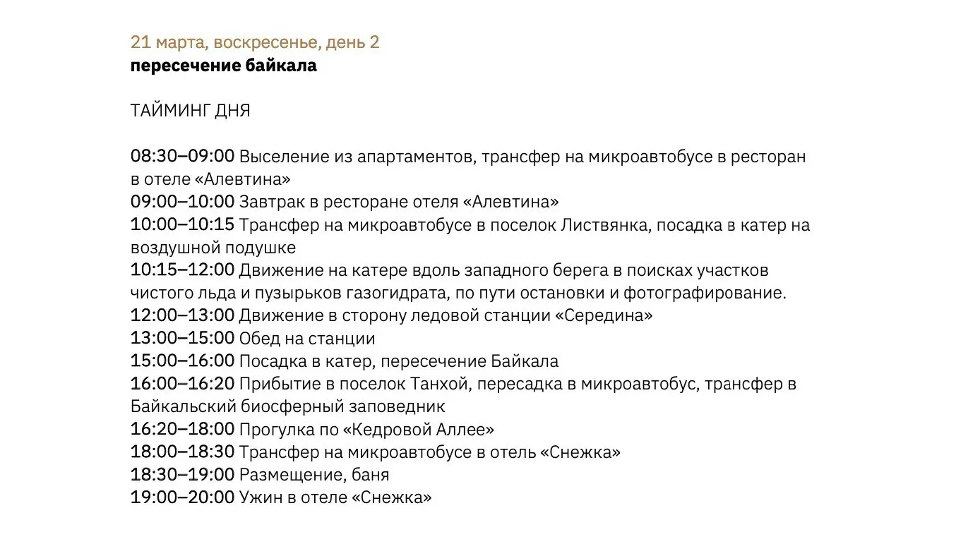 В него входит презентация программы по дням — с ключевыми точками маршрута и логикой путешествия. К ней добавляется тайминг: время перемещений, паузы и важные стыки по дороге. Также передаем смету — она разбита по категориям расходов, чтобы было понятно, из чего складывается бюджет.