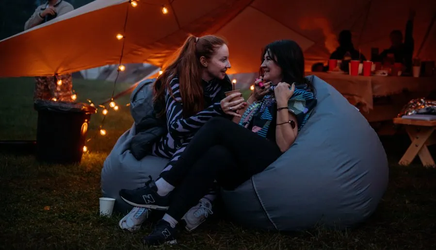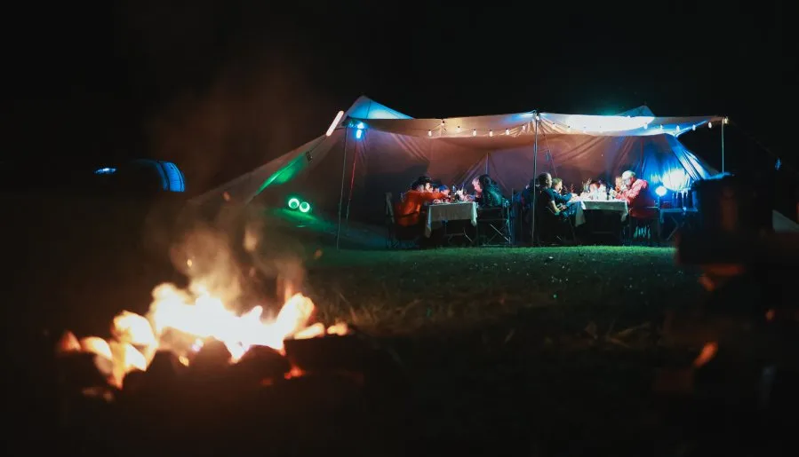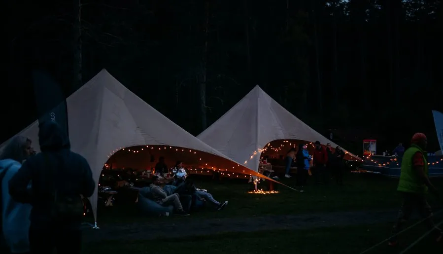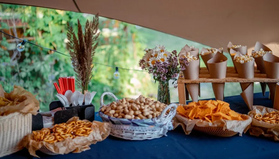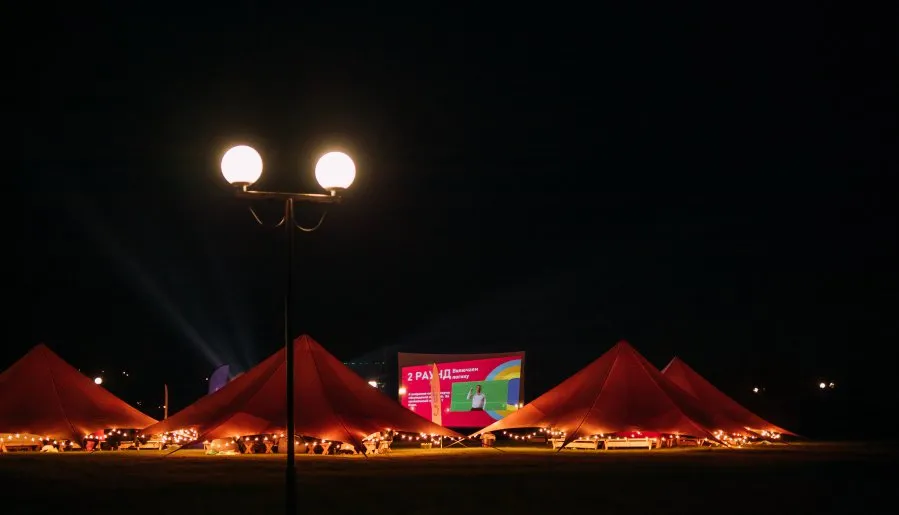 - кейтеринговая зона с шатрами, столами, стульями, освещением и уютным декором;