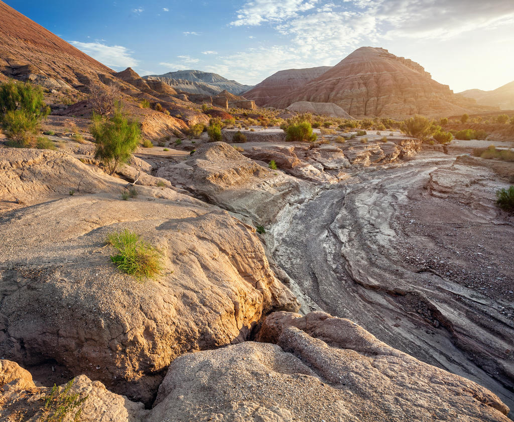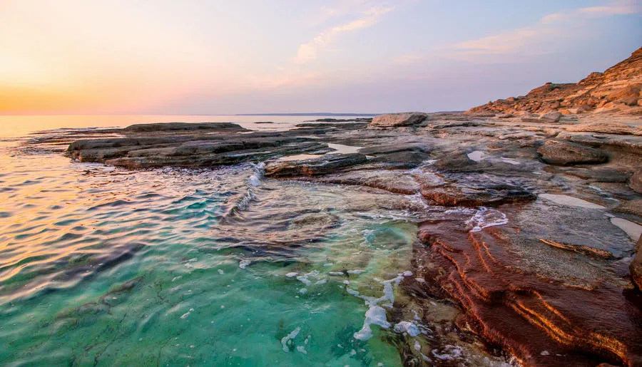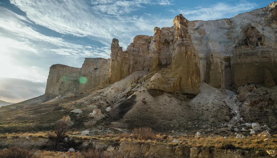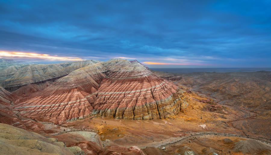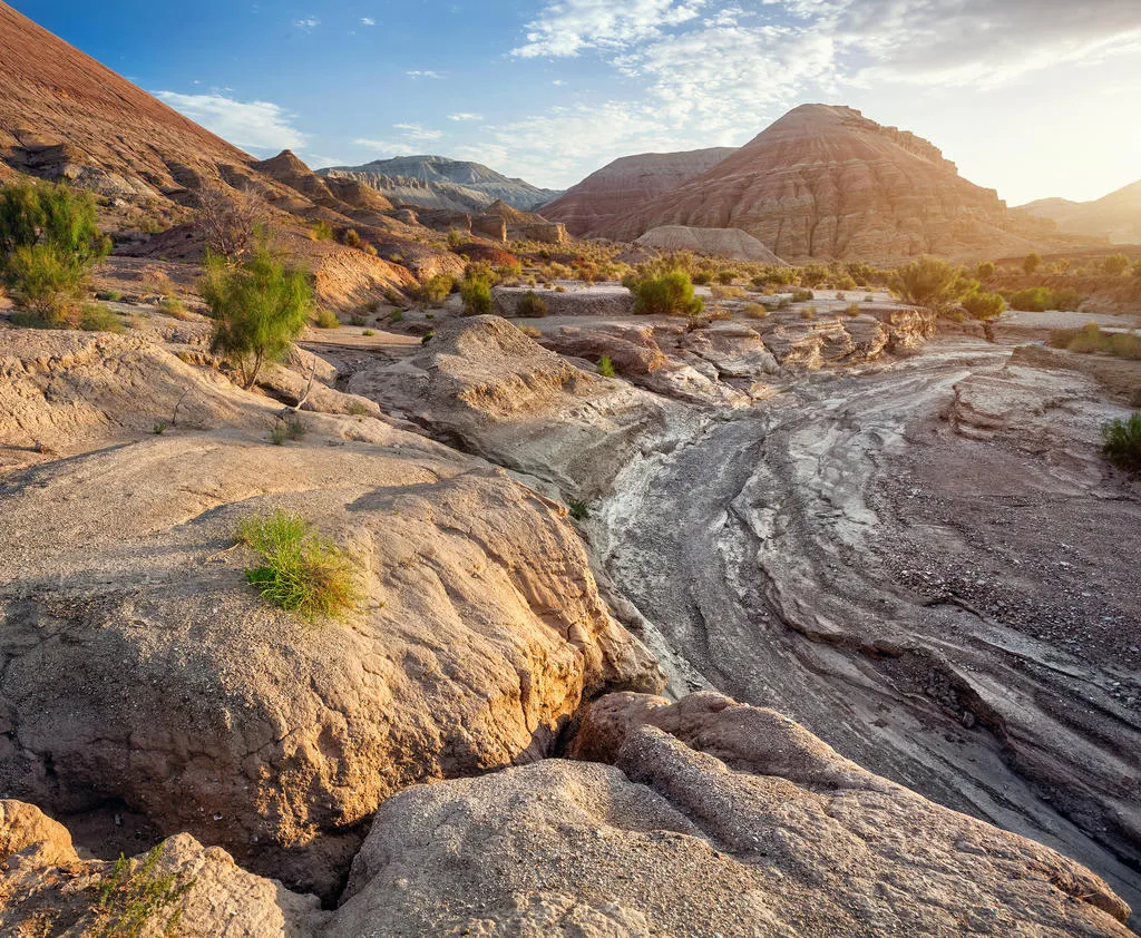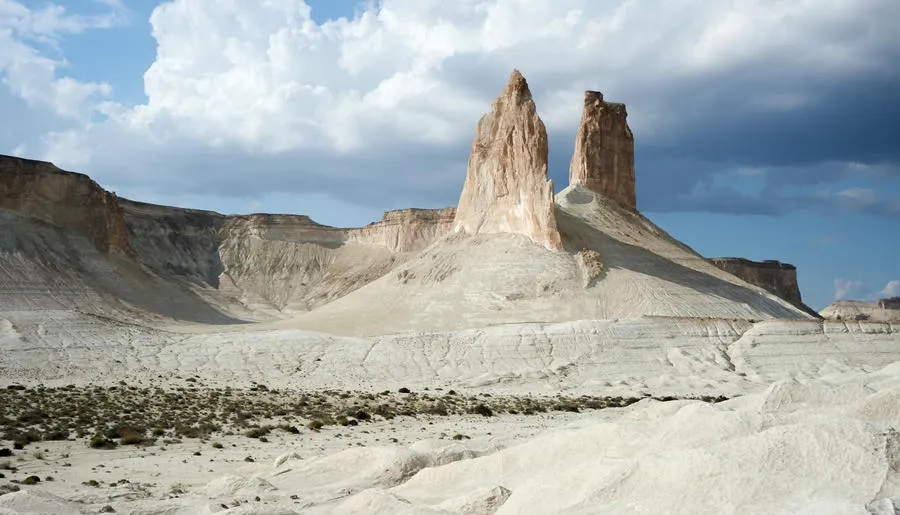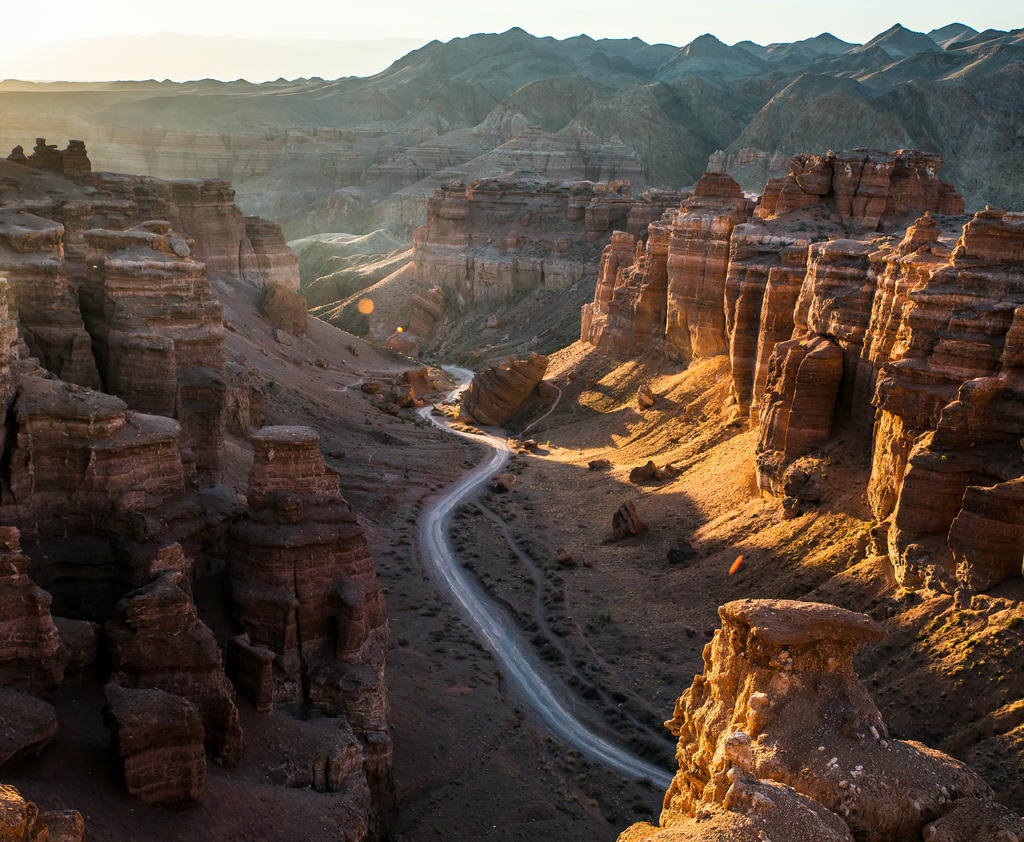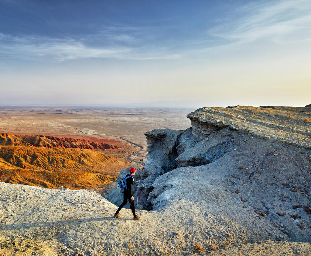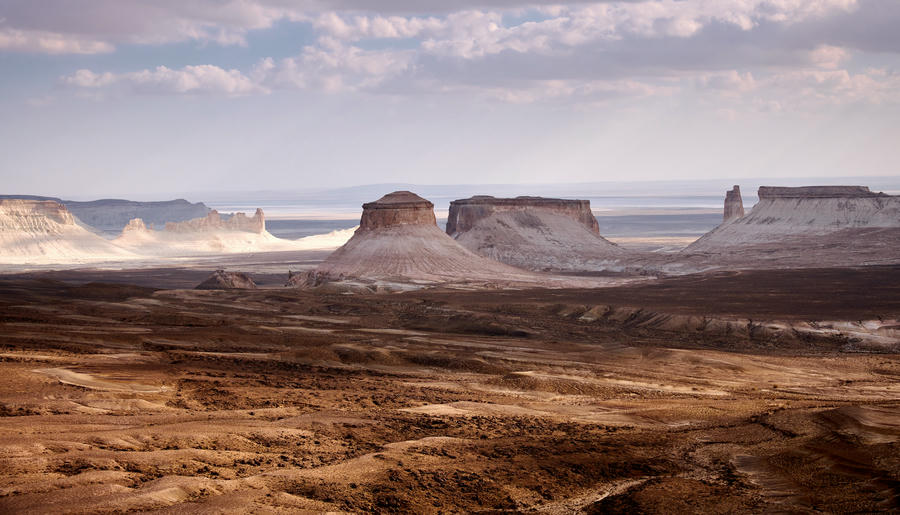 Настоящий затерянный мир с космическими пейзажами на полуострове Мангистау (Мангышлак). Когда-то здесь плескалось древнее море Титлис, а когда вода исчезла, осталась усеянная окаменелыми раковинами и кораллами пустыня, солончаки и причудливые каменные образования. Особенно впечатляет урочище Бозжира, где одинокие меловые скалы высотой до 300 метров торчат посреди голой равнины. Среди других поразительных объектов — каньон Ыбыкты с ажурными как пористый шоколад скалами, Долина Шаров со странными валунами правильной сферической формы и мечеть Бекет-Ата, вырубленная в скалах в 17 веке.