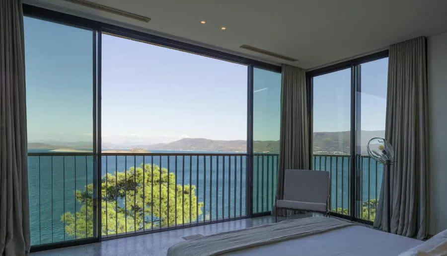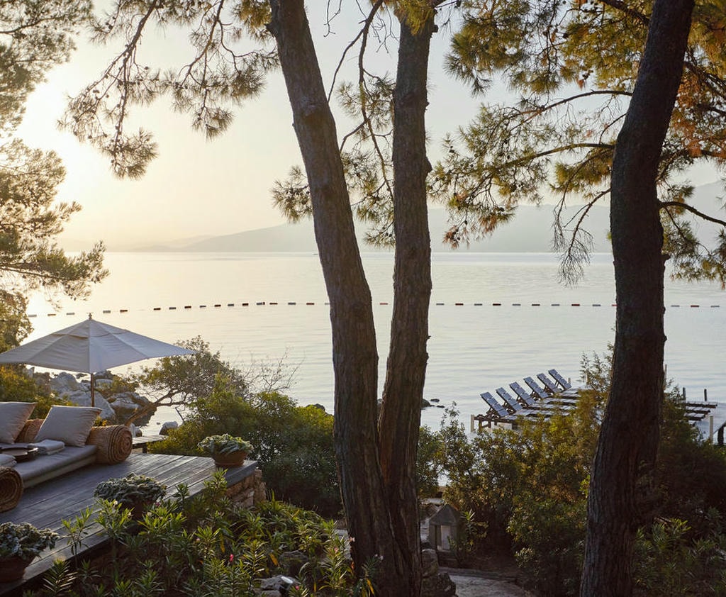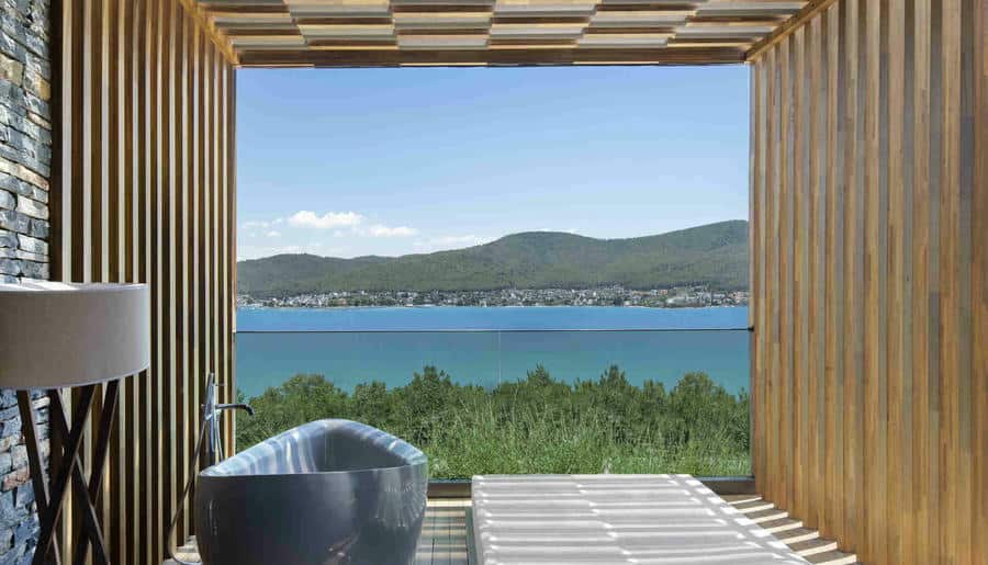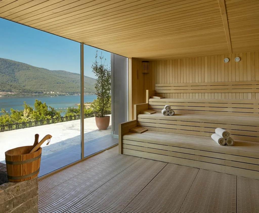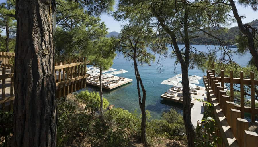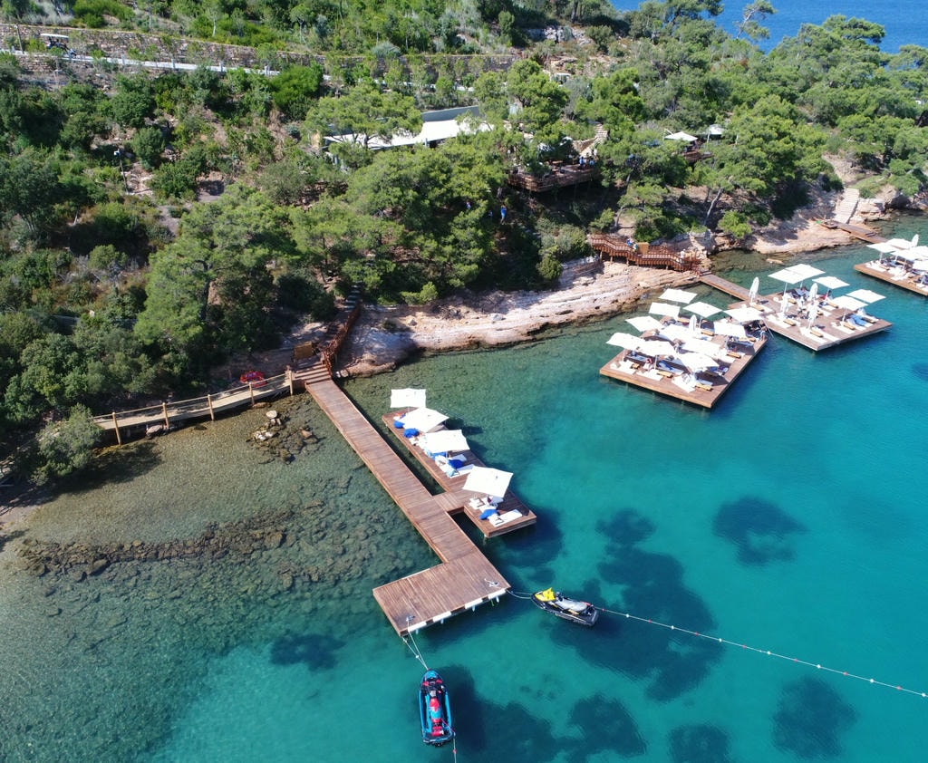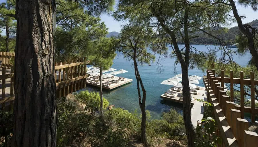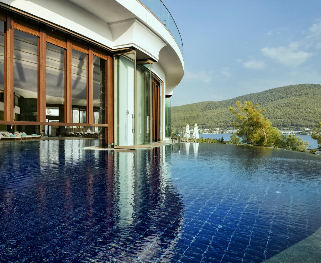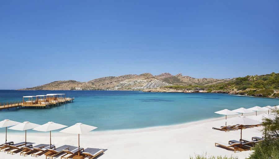 Отель находится в укромной бухте Парадайс-бэй («Райская бухта»), среди оливковых рощ и сосен. Здесь действительно тихо, только звук волн и легкий бриз. До центра Бодрума около 20 минут на автомобиле, но из отеля не хочется уезжать. Виллы с панорамными окнами и закрытый песчаный пляж подчеркивают атмосферу приватного курорта.