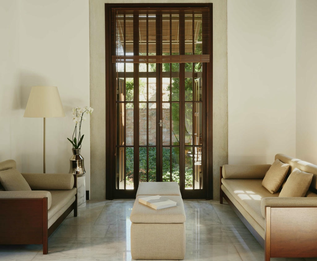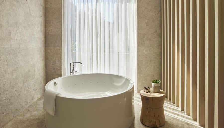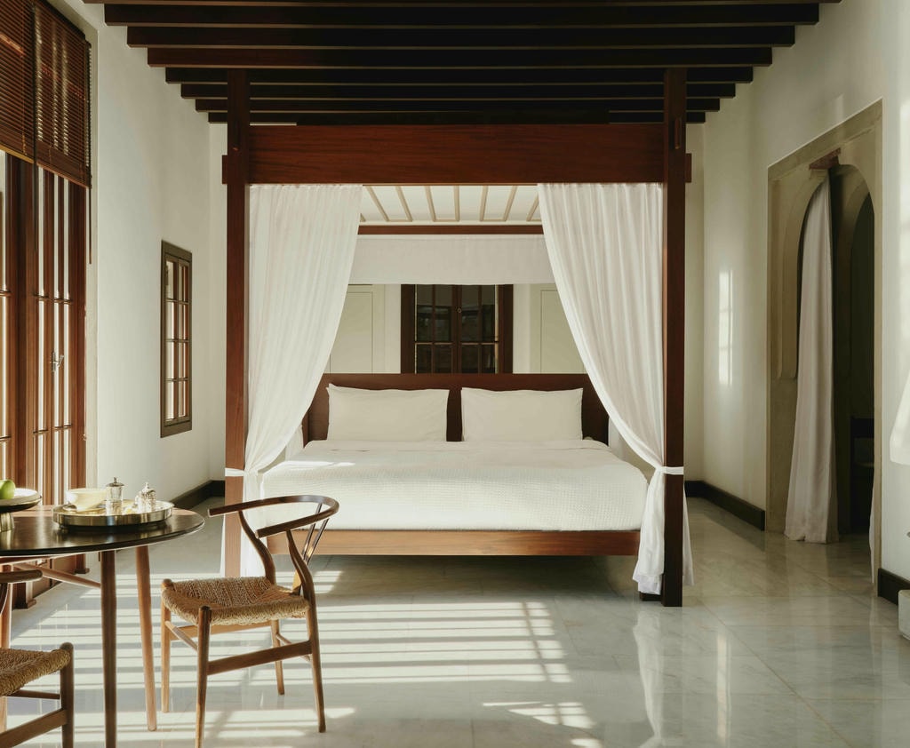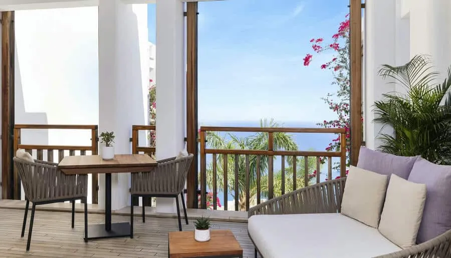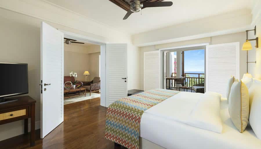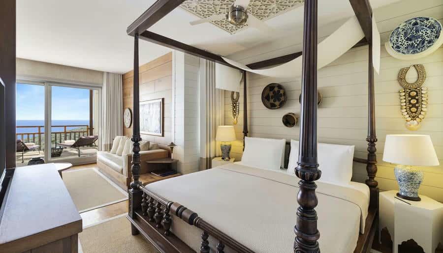 В отеле 110 номеров и люксов — светлых, просторных, с панорамными террасами. Площадь варьируется от 42 до 217 м². Интерьеры выполнены в стиле «белое на белом»: обилие света, натуральное дерево, много воздуха. Ванные комнаты отделаны мрамором, установлены глубокие ванны и тропические души. В люксах отдельная гостиная и мини-кухня.