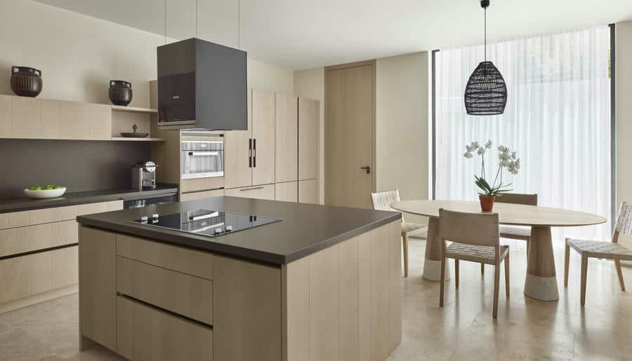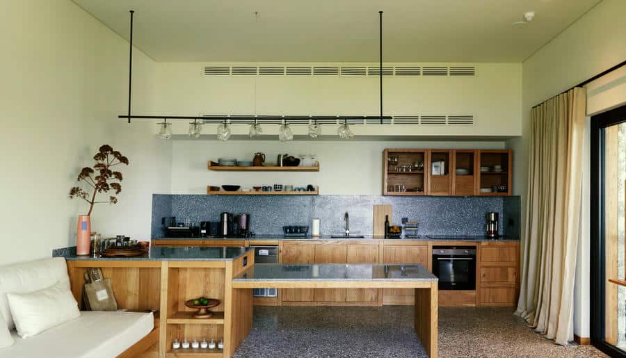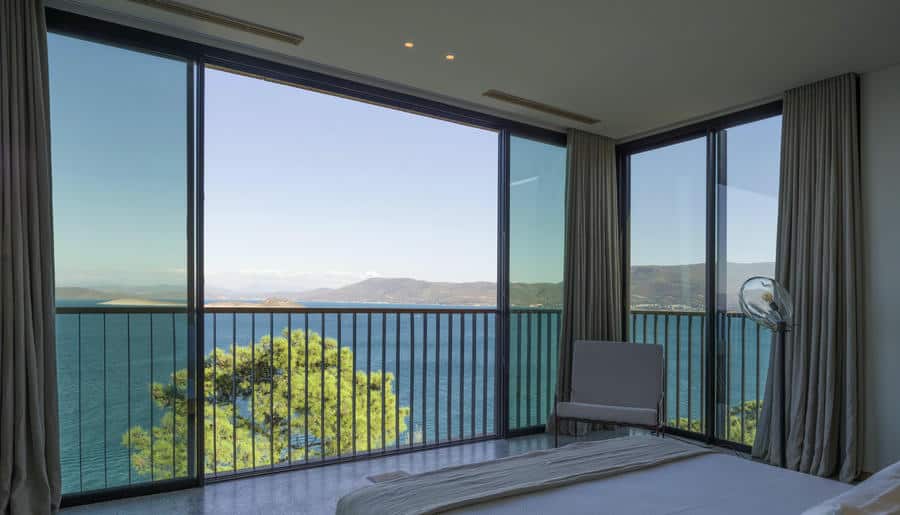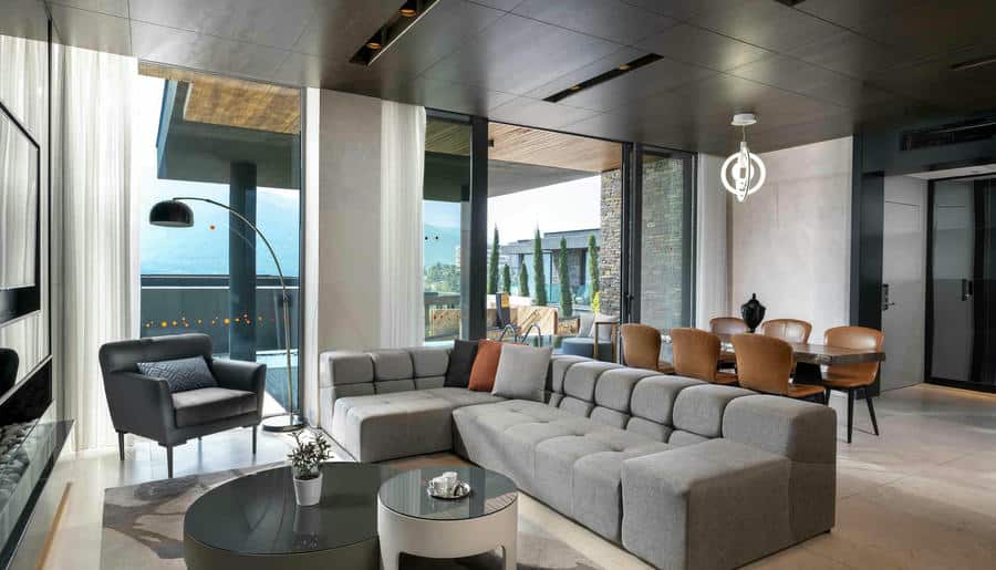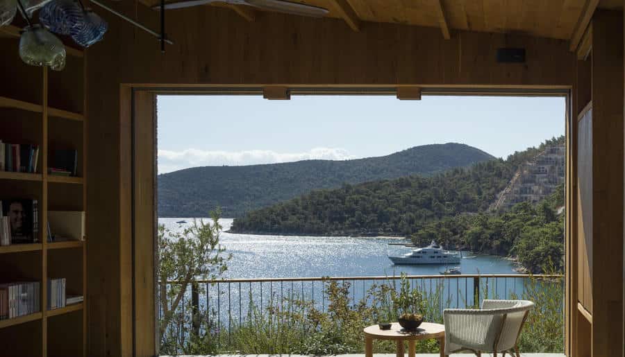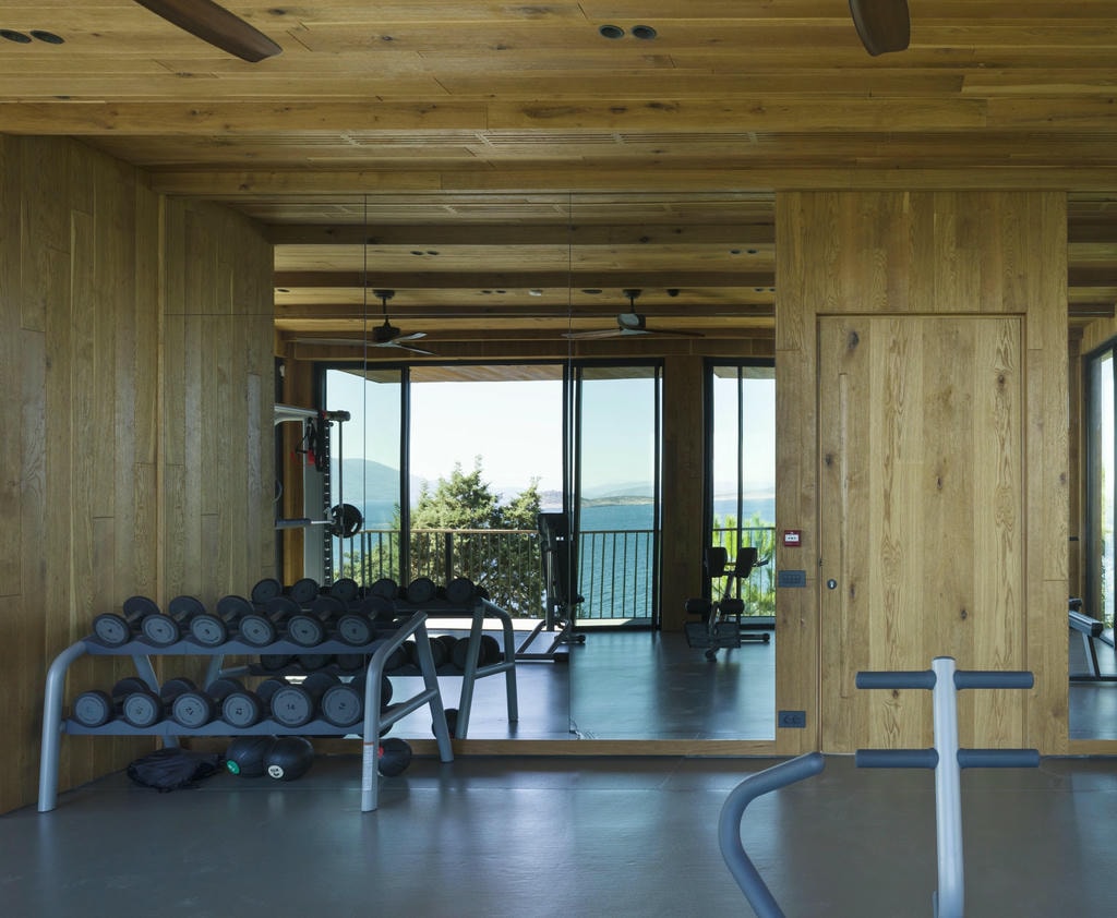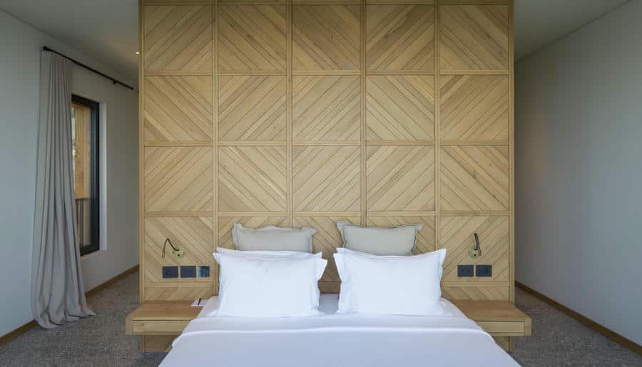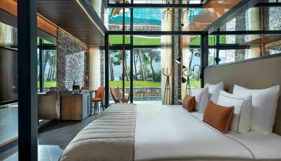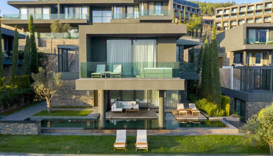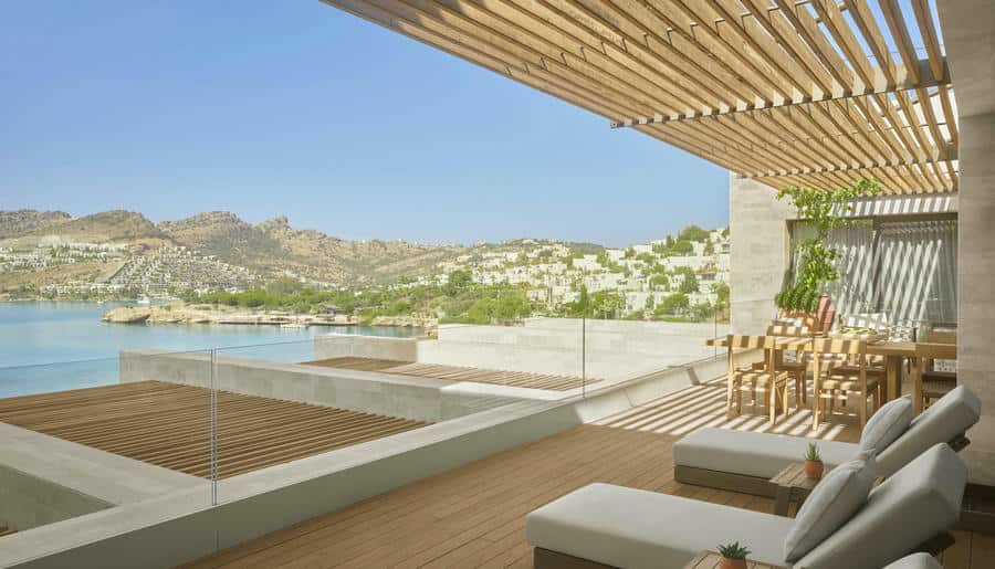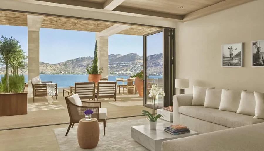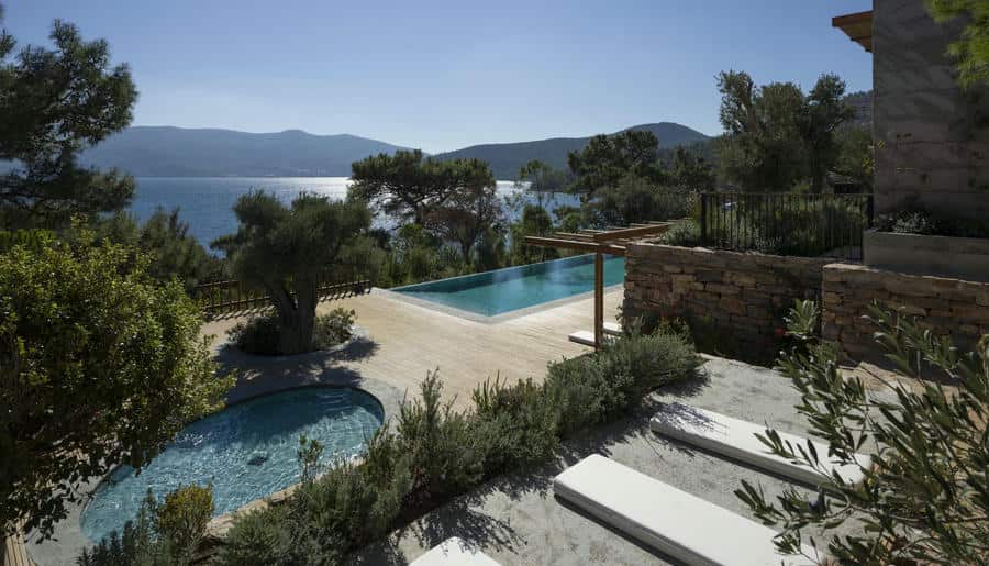 Есть виллы и апартаменты с 3–4 спальнями, просторными гостиными и личными бассейнами. Панорамные окна, террасы, лаунж-зоны выходят на Эгейское море. Интерьеры выполнены в стиле минимализма с помощью натуральных материалов: камня, дерева, текстиля.