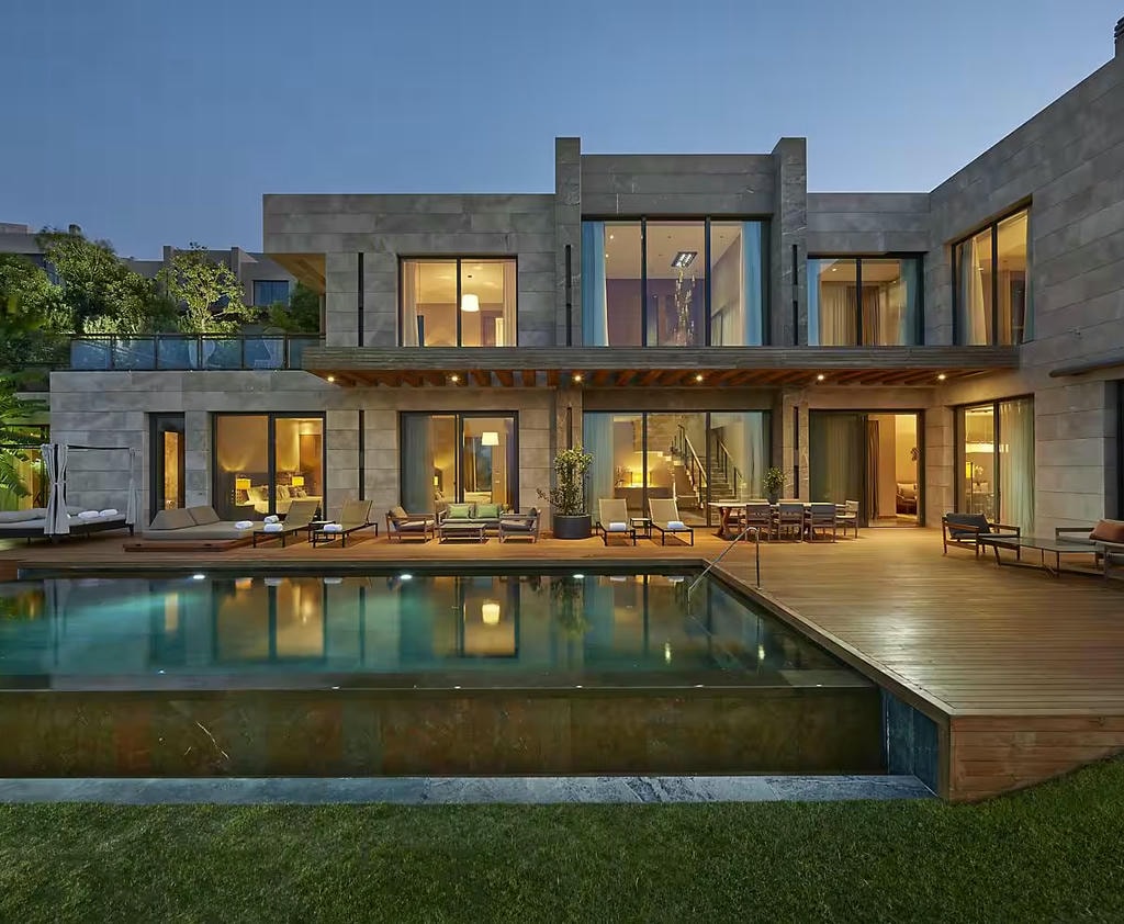 Для тех, кто ищет максимальный комфорт, есть отдельная 3-этажная вилла площадью 537 м². Там четыре спальни, сауна, собственный бассейн, панорамные виды на каждом этаже.