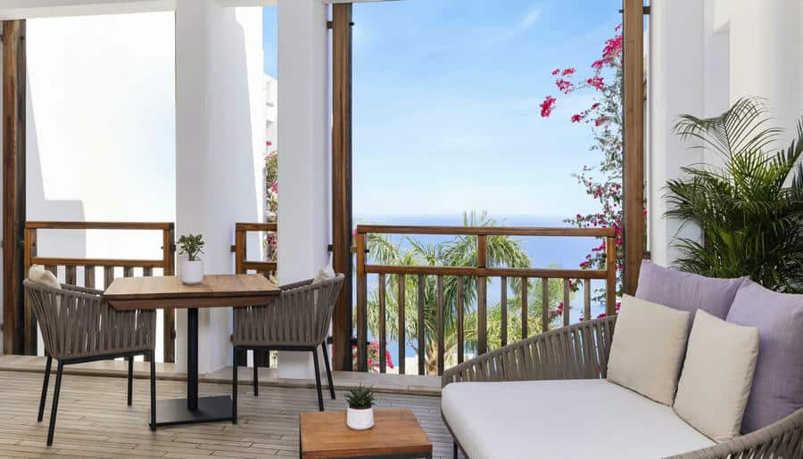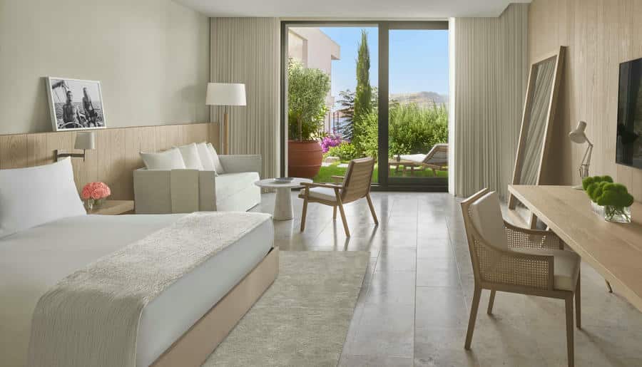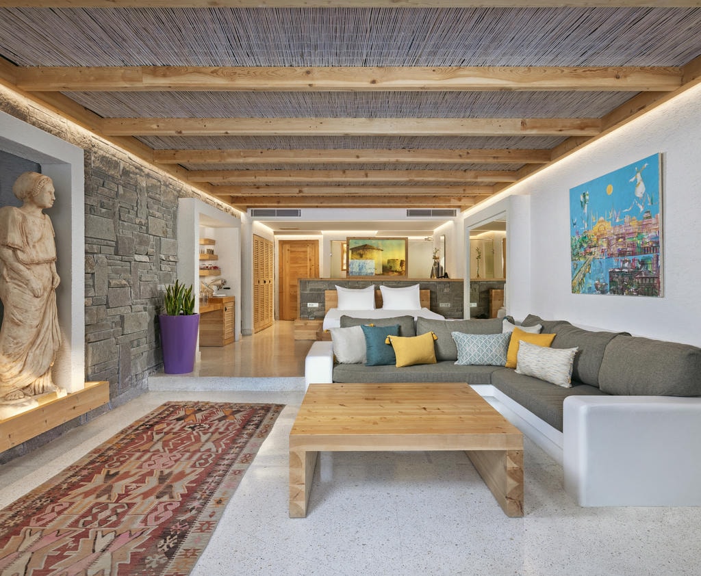 В отеле 173 номера, люкса и виллы, в том числе компактные улучшенные номера и роскошные президентские апартаменты. Интерьеры оформлены в средиземноморском стиле с помощью натуральных материалов. Здесь есть приватные террасы, комнаты с балконами и окнами в пол, завораживающие виды Эгейского моря на рассвете.