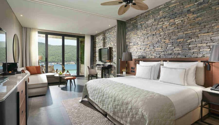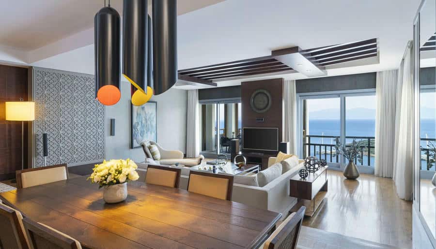 На выбор доступны номера (35 м²) и делюксы (35–40 м²) с видом на море и современными интерьерами, полулюксы и люксы (45–65 м²) с просторными зонами отдыха и спальнями. Больше пространства в президентском люксе — 201 м², абсолютная приватность и панорама на залив. Виллы — от 130 до 200 м², с видом на море или сад, отдельными гостиными и террасами.