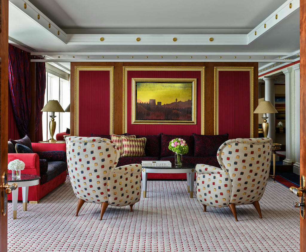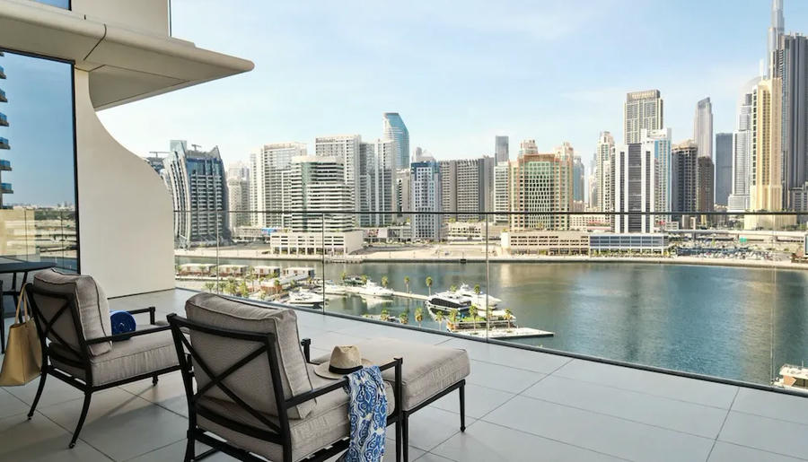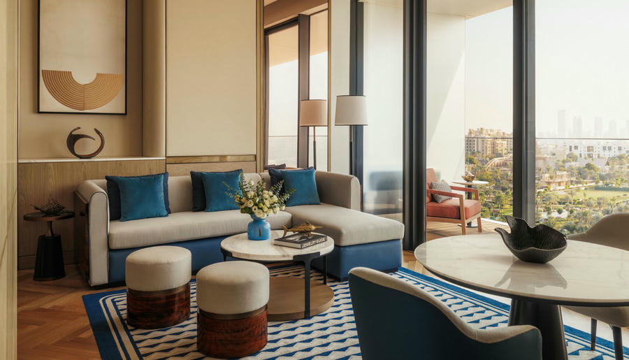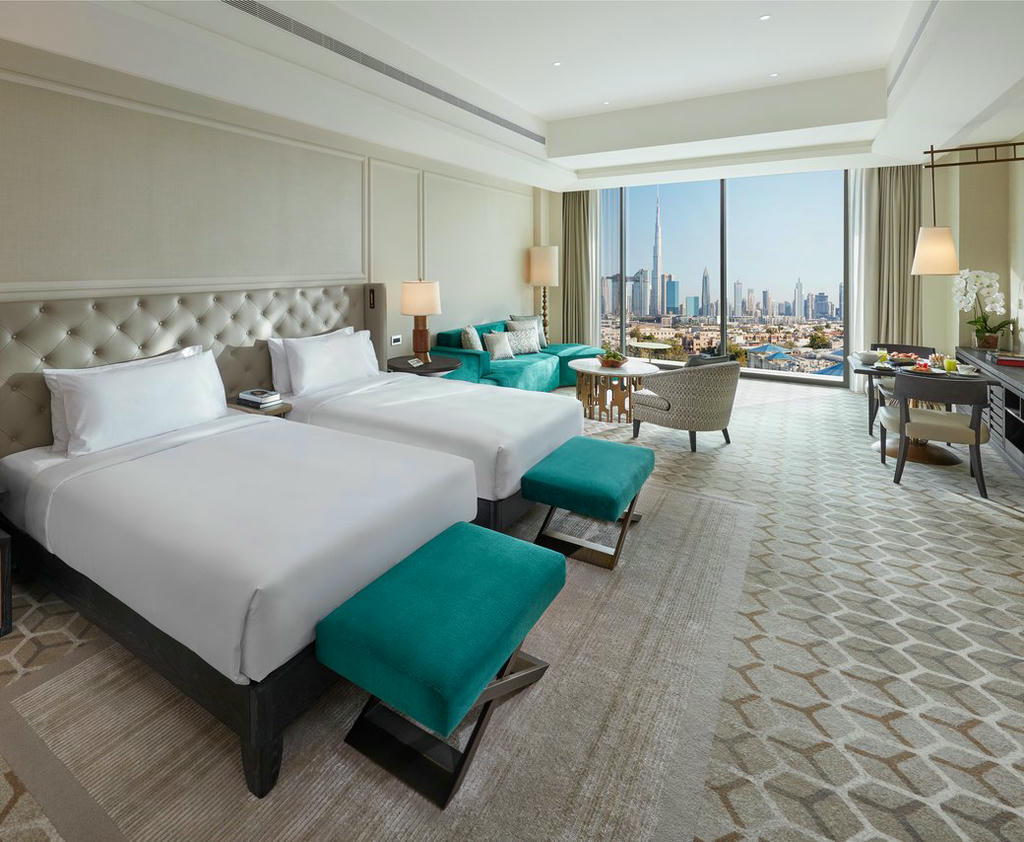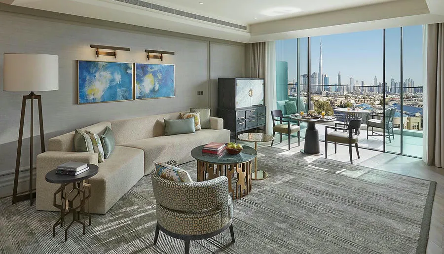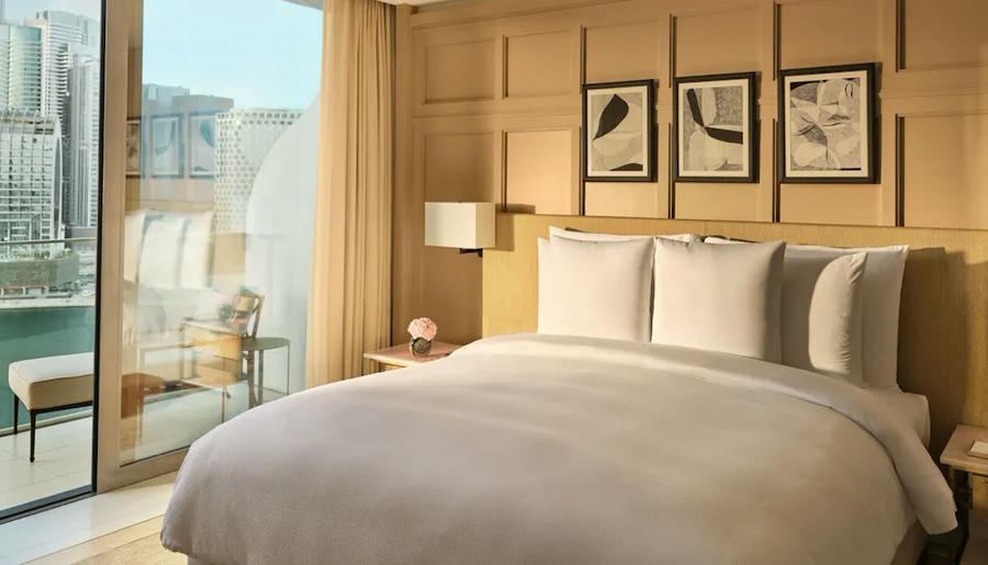 Каждый из 225 номеров и люксов оформлен студией «Жиль и Буасье» в стиле элегантного минимализма: мягкие линии, натуральные материалы, вид на канал и небоскреб «Бурдж-Халифа». В люксах находятся приватные лаунж-зоны, балконы и панорамные террасы. В знаковых люксах есть личный бар, винный шкаф и возможность организовать приватный ужин. Ванные с мрамором «Арабескато», косметикой «Ле Лабо» и отдельными ванными с видом на город. Гостям доступны круглосуточные услуги личного дворецкого и сервис распаковки и упаковки багажа.