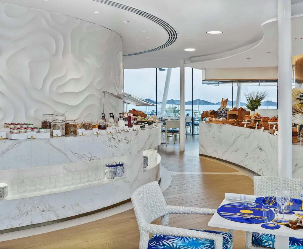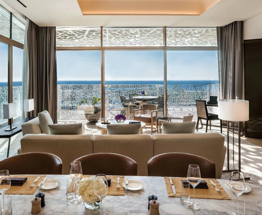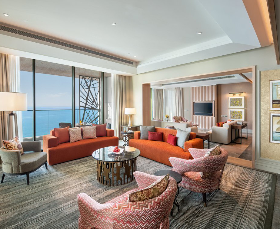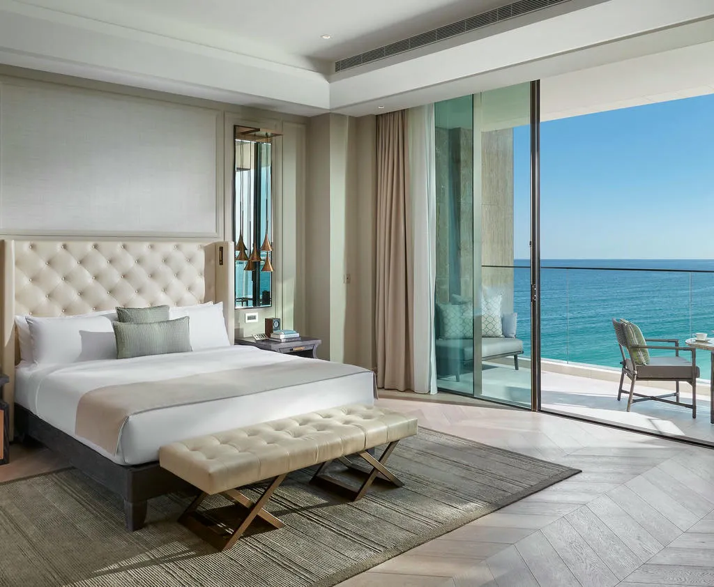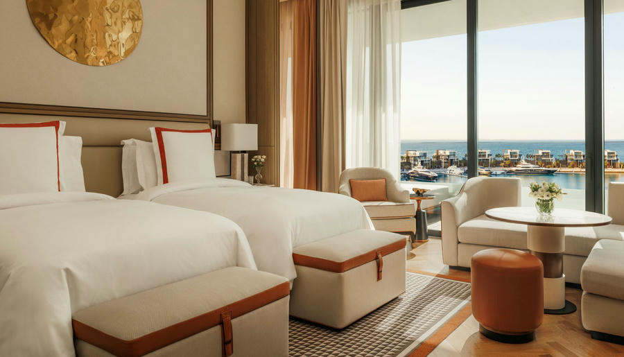 В отеле 386 номеров и люксов, каждый из которых оформлен в мягких песочно-морских тонах с панорамными окнами, открывающими виды на залив и горизонт. Простор, свет, минимализм и изящные детали: здесь ничто не отвлекает от ощущения покоя и статусности.