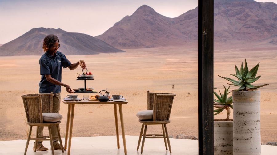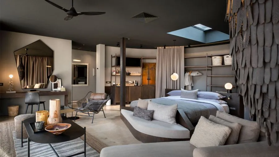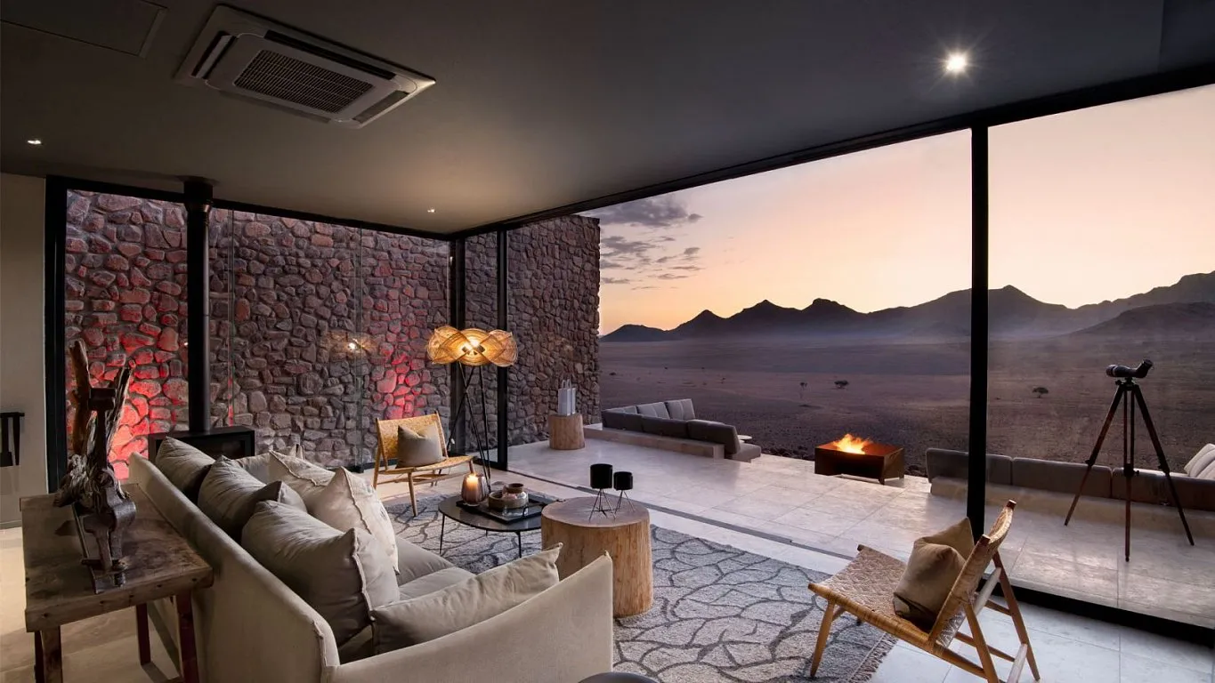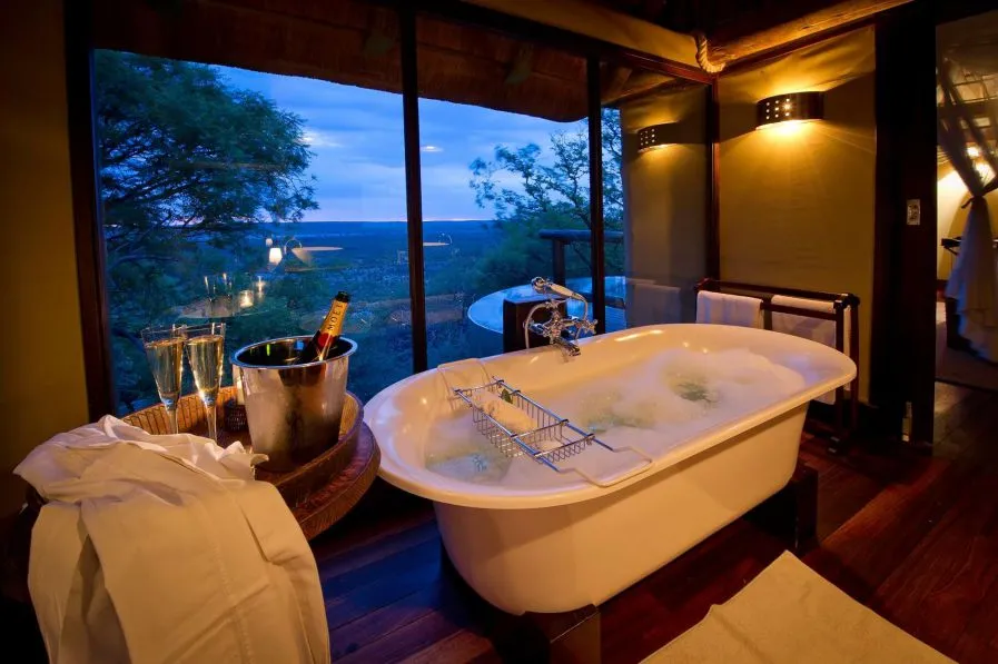 В каждом люксе есть кондиционер, затененная веранда с собственным бассейном, гостиная с камином и ванная комната со стеклянным тропическим душем, откуда открывается вид на 180 градусов. В зоне мини-бара найдется мороженое ручной работы, намибийский джин, южноафриканский ром и кофемашина. Телевизоры в номерах отсутствуют, чтобы не отвлекать гостей от созерцания местных ландшафтов. Шале оснащены вай-фаем и блютуз динамиком, чтобы включить любимую музыку и нарисовать свой первый африканский пейзаж красками, которые для гостей оставляют сотрудники лоджа на рабочем столе.