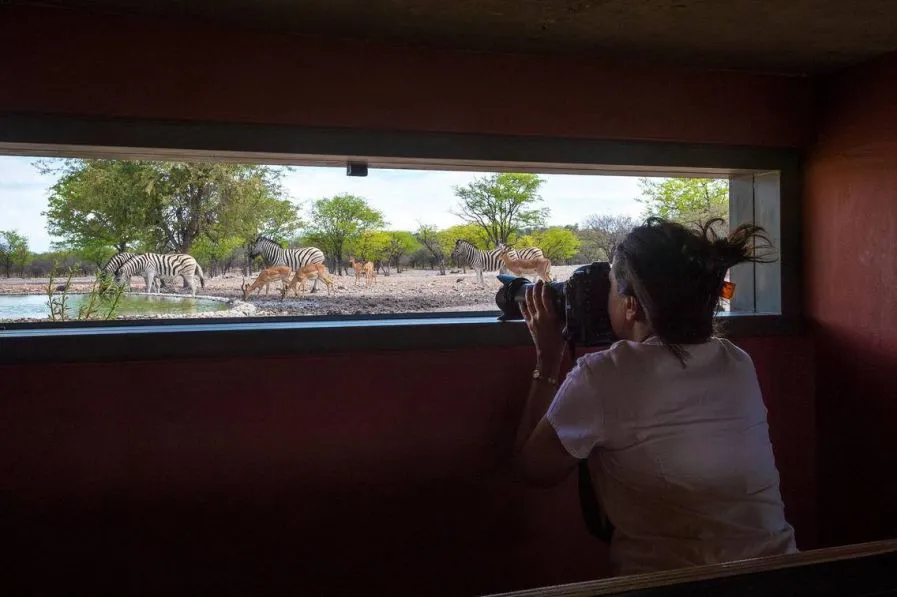 С террасы ресторана открывается великолепный вид на дюну Элим и освещенный водоем. Пока не стемнело, здесь можно наблюдать за проходящими мимо ориксами, спринбоками, шакалами, страусами, наслаждаясь едой и вином.