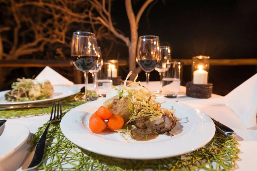 Шеф-повар лоджа называют свою кухню «креативной и элегантной». Особое внимание он уделяет оформлению блюд при подаче. Меню меняется в зависимости от сезона. Традиционно гостям предлагают стейки из антилопы и мясные колбаски с пивом. А на завтрак обязательно будут свежие круассаны и кофе. Десерты — особая гордость ресторана, их готовят с использованием местных продуктов и цветов.