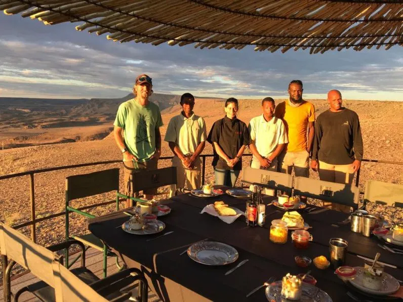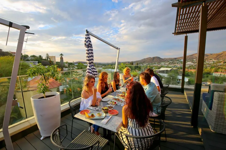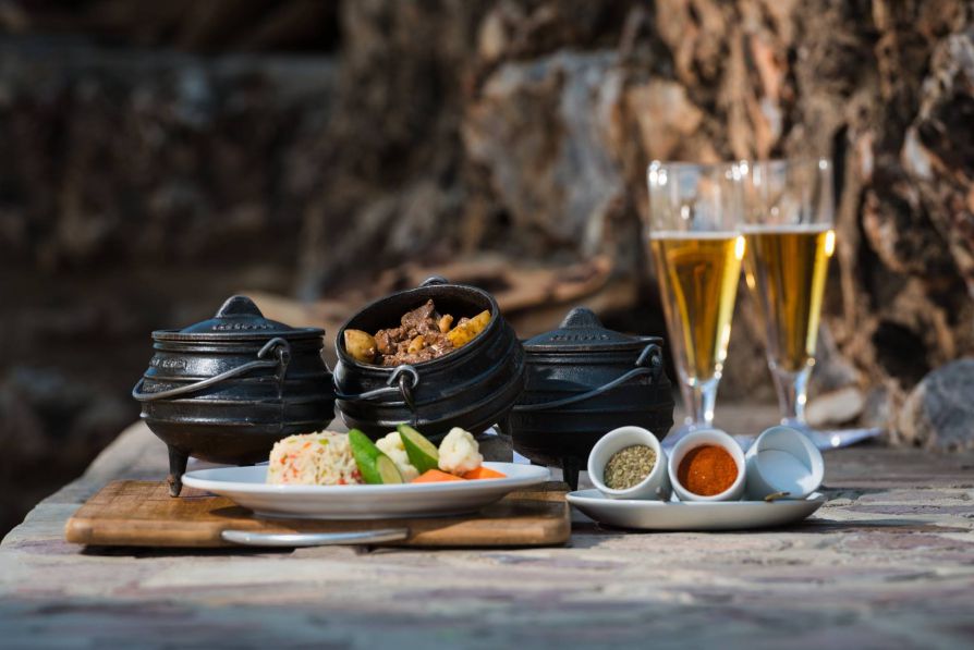 Обеды и ужины в хорошую погоду накрывают на открытой террасе. В меню в основном блюда международной кухни, но есть и фирменные намибийские блюда — мясо дичи приготовленные на углях, колбаски из баранины, тушеное мясо с овощами в горшочках, рыба на гриле с кус-кусом. Во время сафари и экскурсий организуются пикники на природе с коктейлями, винами и легкими закусками.