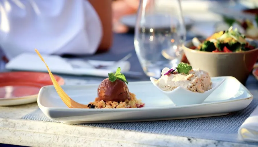 Ресторан авторской кухни предлагает гостям на завтрак несколько сетов: с яичницей и жареным беконом, гранолой и йогуртом, панкейками с ванильным мороженым или традиционный французский завтрак с круассанами и джемом. На обед подают легкие закуски из фасоли, салаты, овощной буррито и жаркое. Меню ужина сезонное и меняется каждые пять дней, но всегда здесь можно заказать стейк из мяса антилопы или морепродукты, которые приготовят в вашем присутствии на гриле.