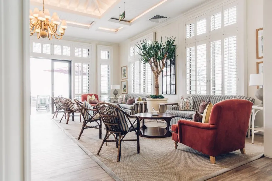 На выбор шесть типов номеров — от стандартов до президентских люксов. Во всех 125 номерах есть бесплатный вай-фай, мини-бар и плазменный телевизор, ортопедический матрас, панорамные раздвижные двери, вид на главный пляж Свакопмунда, Атлантический океан, город или тихий сад. В люксах есть камины и террасы. Интерьер выдержан в классическом немецком стиле Бидермейер, для которого характерны: продуманное освещение, теплые оттенки, мебель из светлых пород дерева, текстиль полосатый и с узором из цветов, много декоративных подушек и картин.