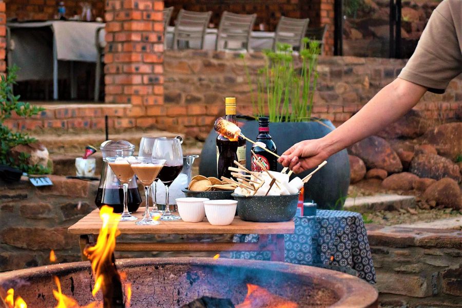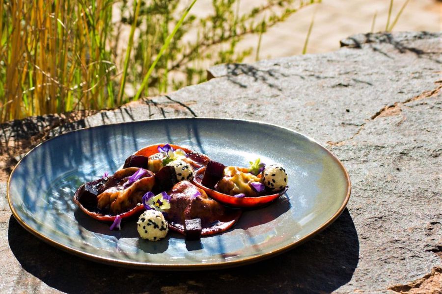 В меню изысканные блюда в стиле кухни района Кару, где находится лодж. Фишка кухни — местные традиции и органика. Например, запеченный конверт из цесарки с пюре из пастернака, подается с жареным молодым луком и инжиром; пирожки панцеротти с орехами, поджаренным маслом и соусом из шалфея; на десерт — коньячное мороженое с теплыми африканскими пончиками коексистер и темным шоколадом. Отдельное внимание уделяется вегетарианскому меню.
