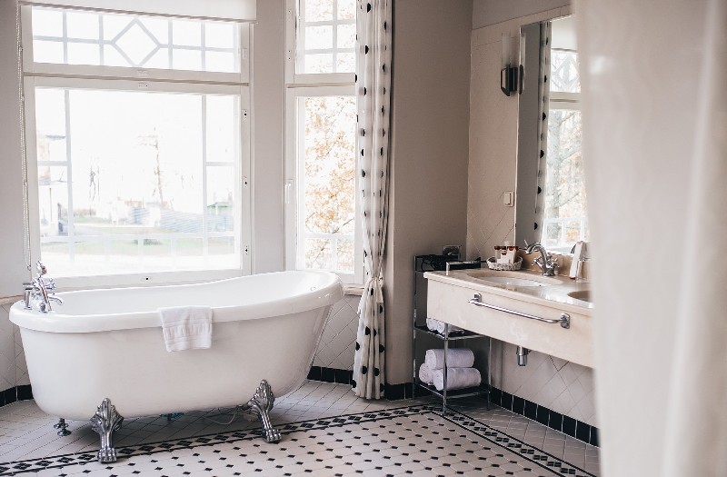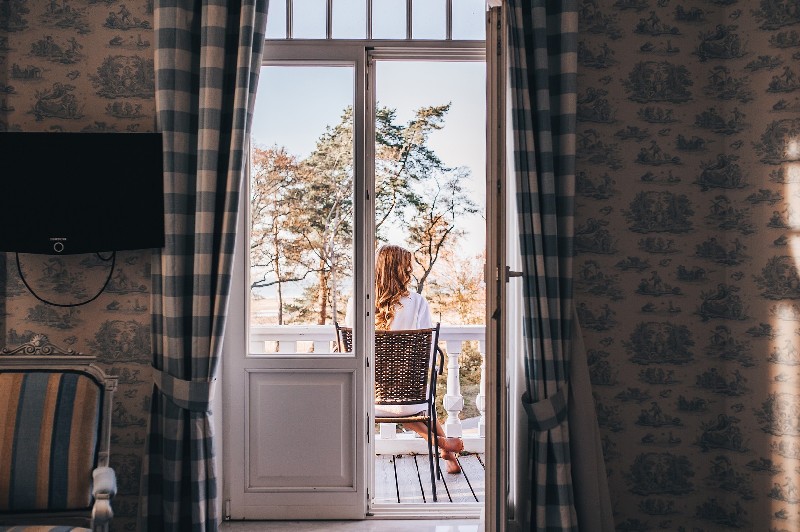 Люкс «Чайковский» — трехкомнатный номер площадью 110 м² с двумя спальнями и ванными, гостиной и меблированной террасой, с которой открывается вид на бассейн и Финский залив.