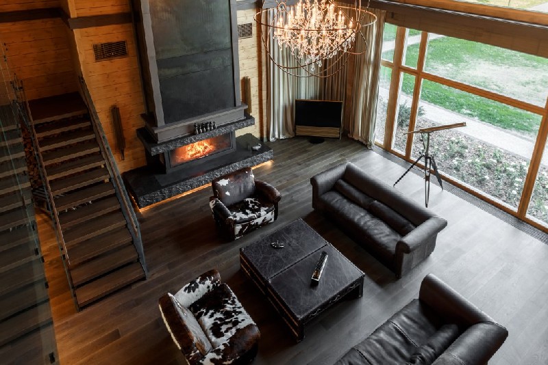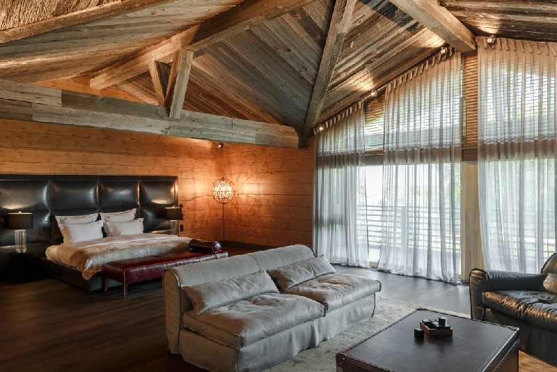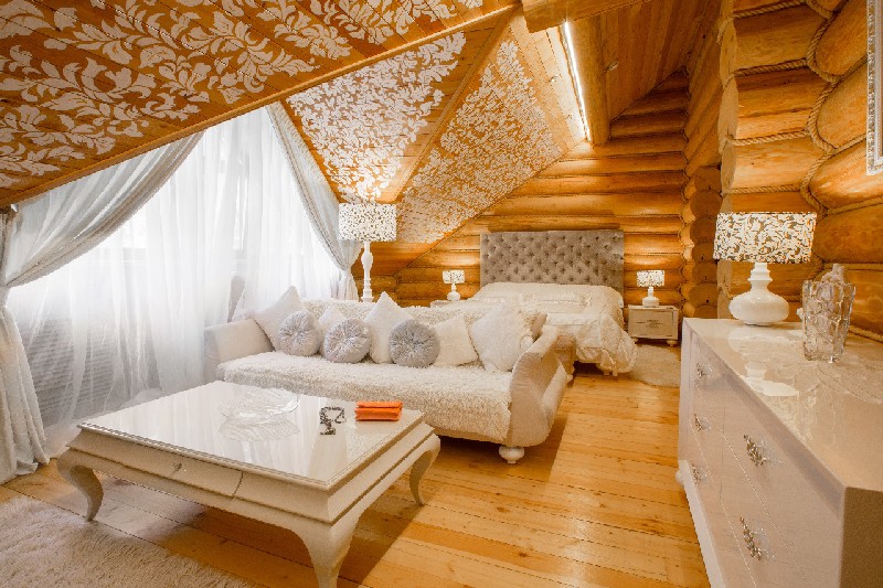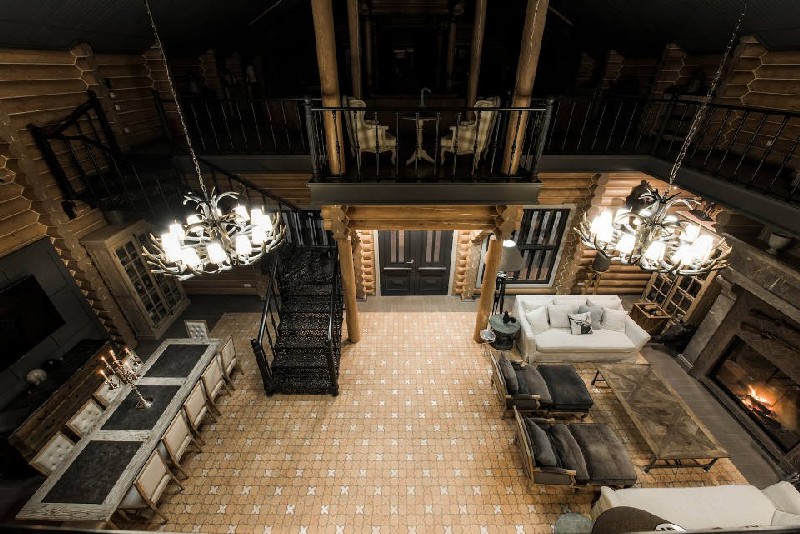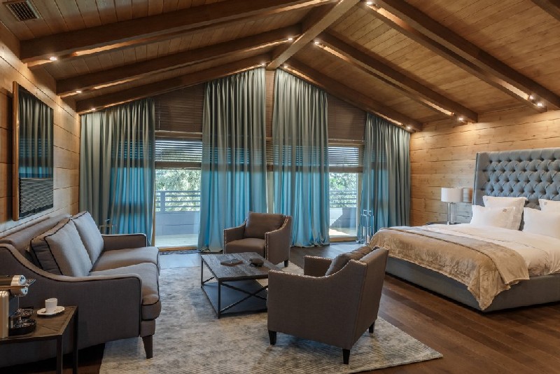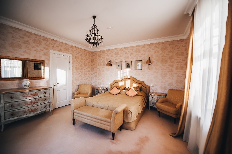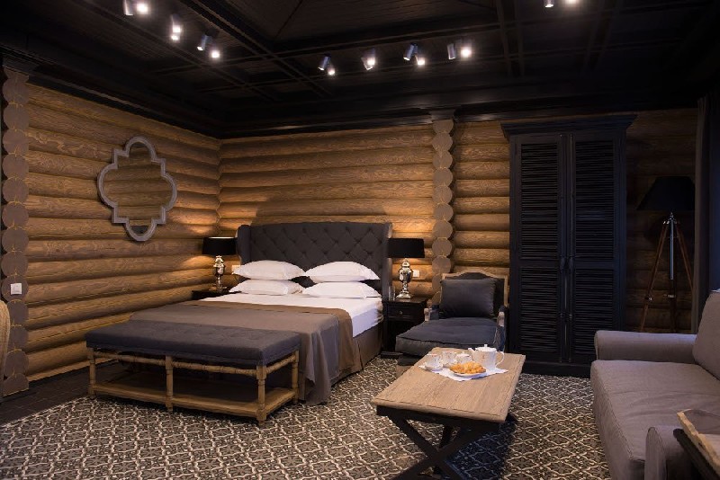 В каждой спальне есть своя ванная комната, туалет, гардероб, а в четырех из них — еще и балкон. В интерьере — преимущественно сосновый брус и спокойные приглушенные цвета. Во внутреннем оформлении номеров и общих пространств использованы винтажные светильники и мебель ручной работы.