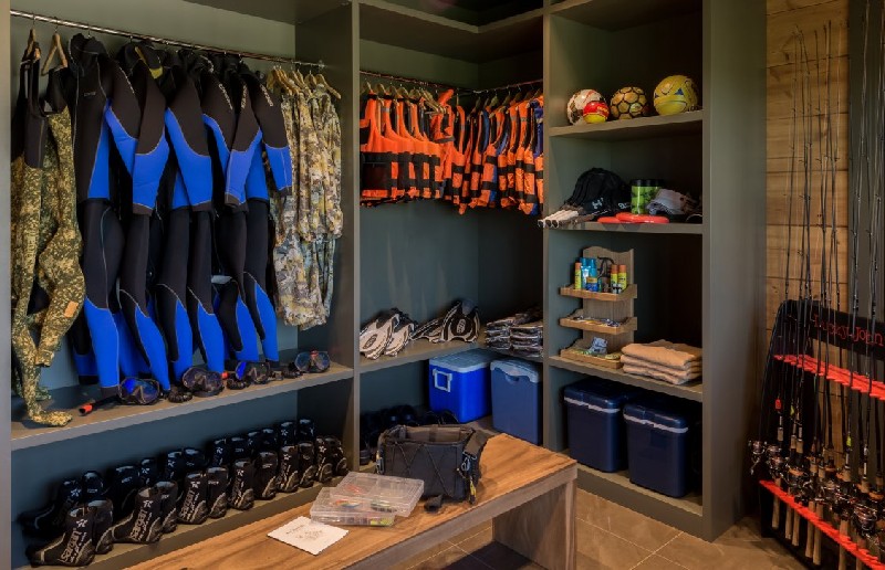 Для тех, кто приехал порыбачить, на первом этаже главного дома есть раздевалка с комплектами рыболовного снаряжения, включая снасти, гидрокостюмы, арбалеты, приманки. У причала стоят три катера, на которых можно отправиться не только на рыбалку, на и на водную прогулку. Катера пройдут по любой воде к рыбным местам, а найти их помогут егеря.