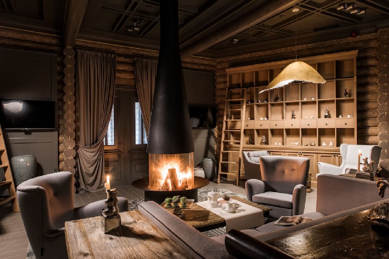 Архитектура, выполненная бюро Rhizome, органично вписывается в ландшафт, фасады украшены лемехом — традиционной осиновой черепицей, отсылающей к храмам острова Кижи. Интерьеры погружают в тишину северной природы: дерево, шунгит, живой огонь и открытый горизонт за окном.