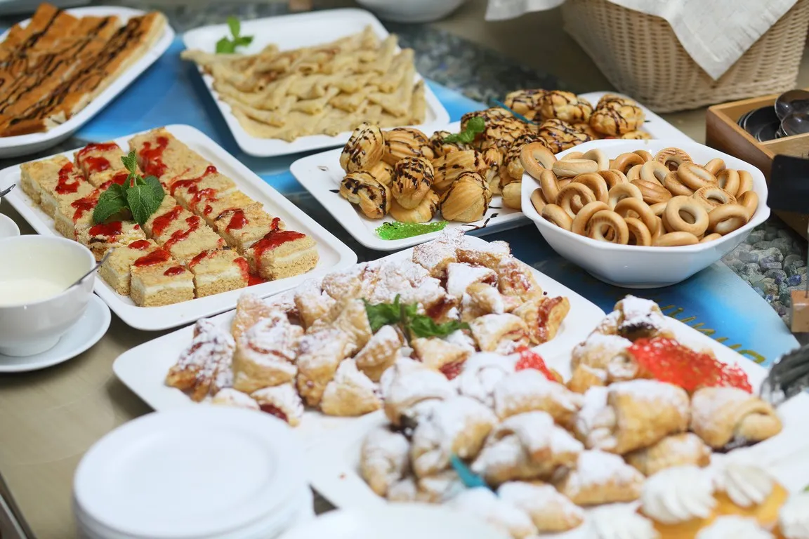 В стоимость номера входит завтрак: шведский стол или по меню. А по выходным наливают добротное игристое.