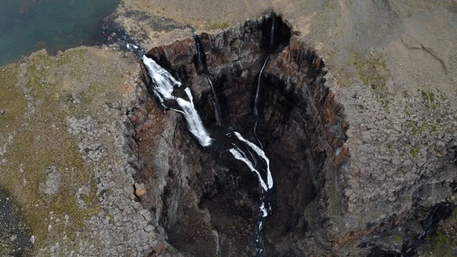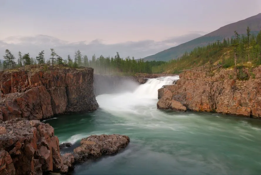 Плато Путорана называют «краем тысячи водопадов». Всю тысячу увидеть сложновато, можно начать с водопада Кандинского. Поток воды бьет будто бы из середины скалы, и вода, пролетев более сотни метров, с треском разбивается о горную породу.