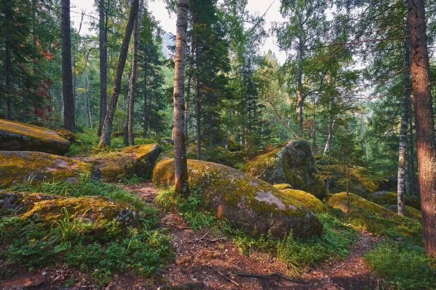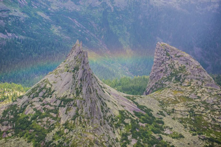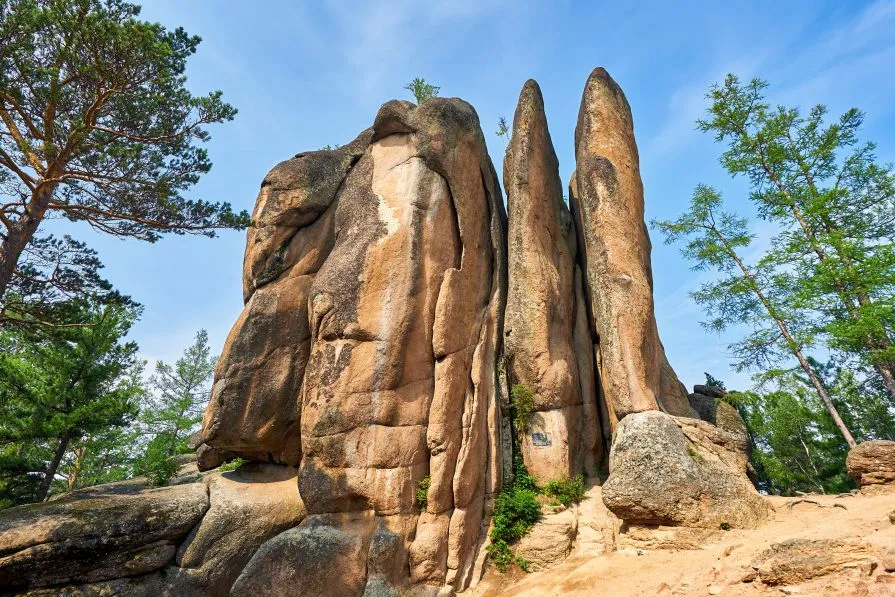 Это огромные гранитные пирамиды причудливой формы. Высота столбов из сиенитовых останцев достигает 80 метров. Окружают удивительных гигантов нетронутые сибирские леса, которые тоже стали частью национального парка «Красноярские Столбы». Растительный и животный мир этих мест уникален, здесь обитают маралы, особые благородные олени, волки, рыси и даже росомахи.