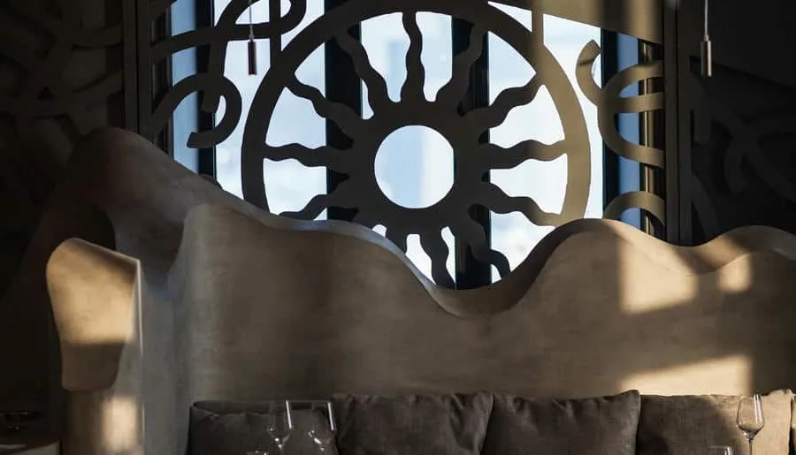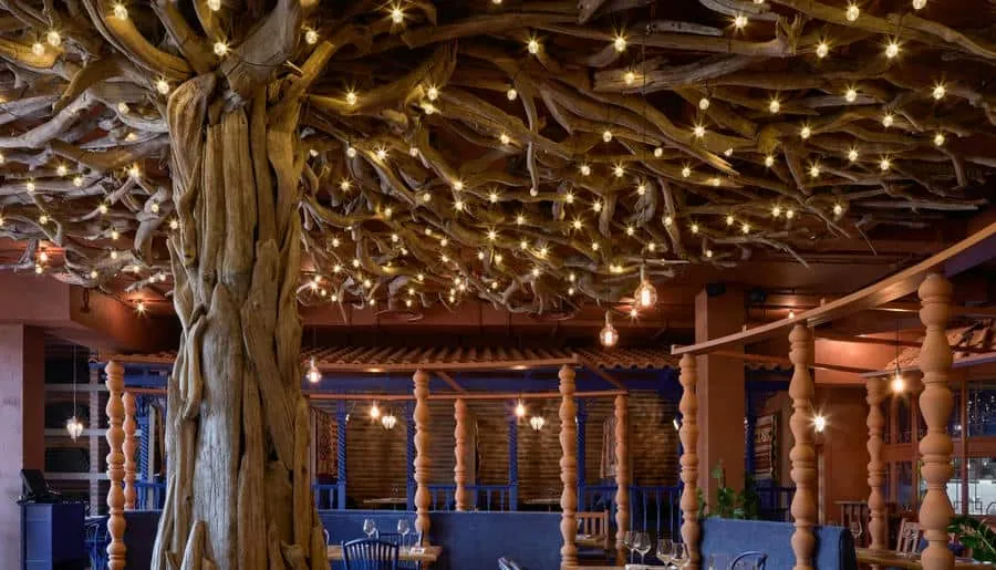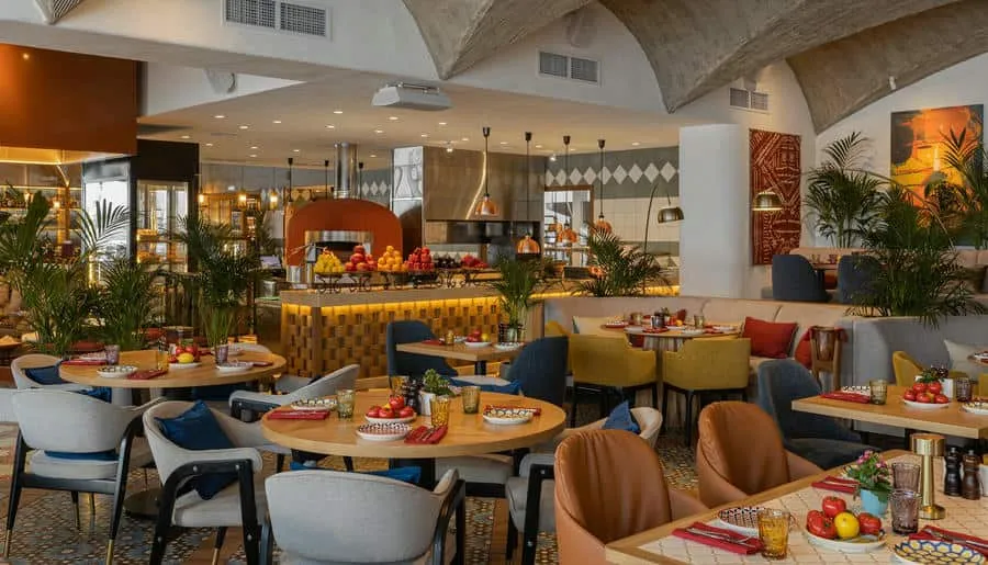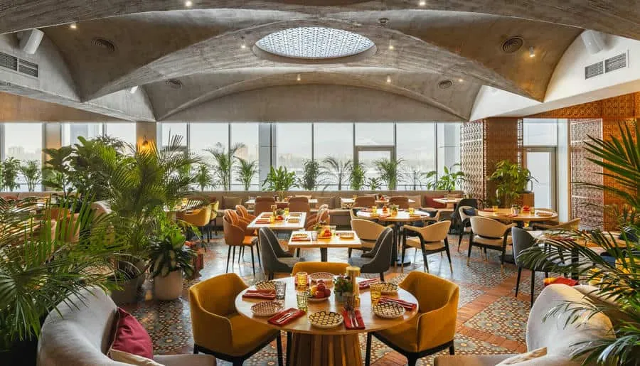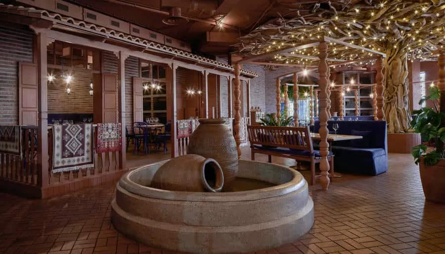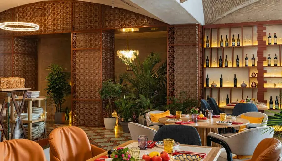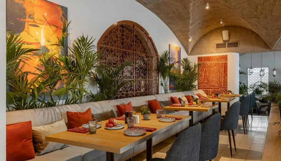 Интерьер ресторана погружает гостей в атмосферу восточного базара с яркими красками, узорной плиткой, мягкими подушками на сиденьях и живыми растениями вокруг. Повара готовят на мангале, в дровяной печи или тажине — традиционной марокканской глиняной посуде.