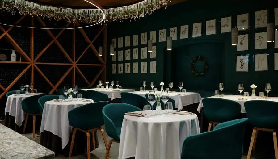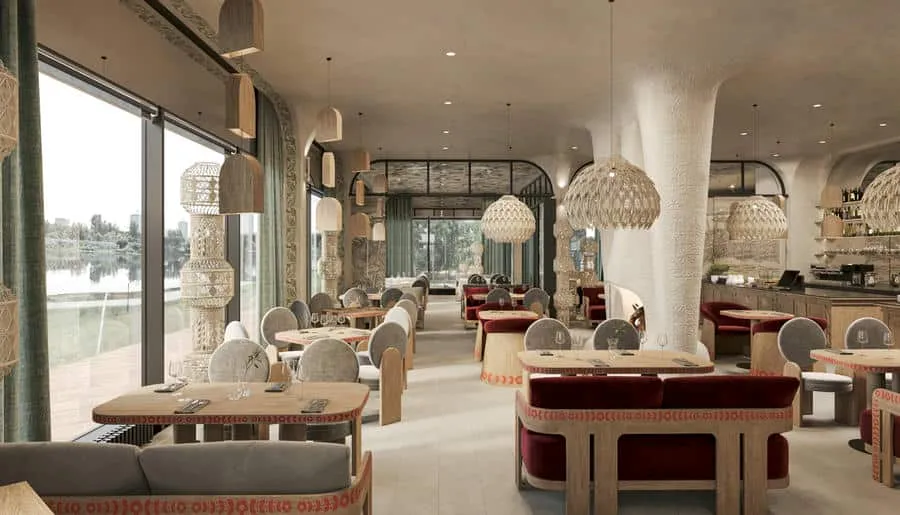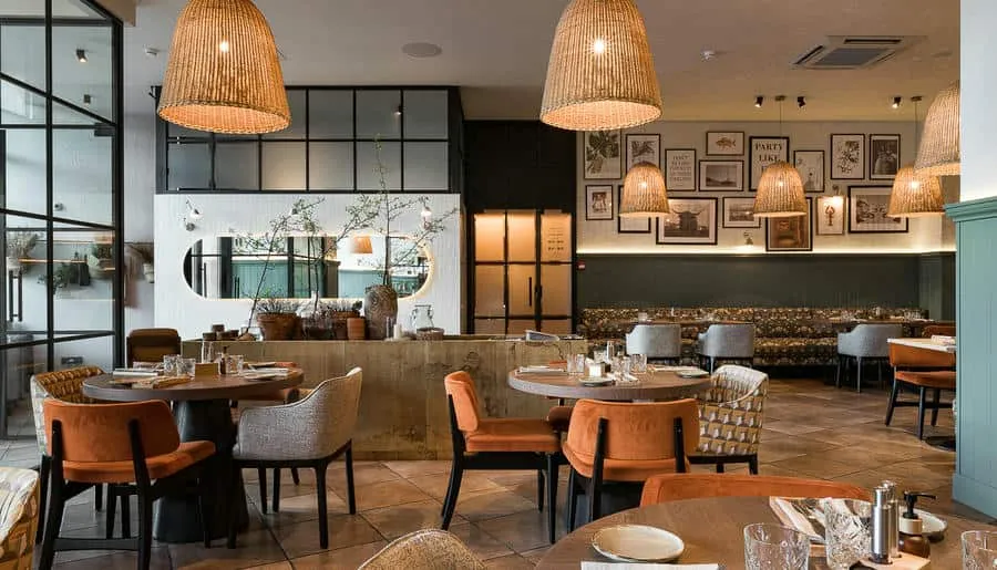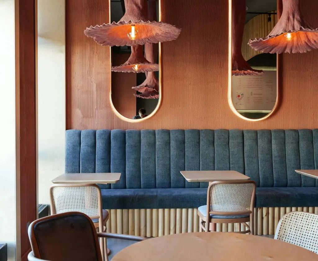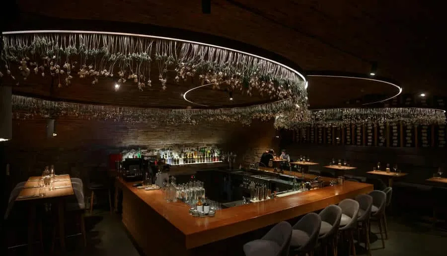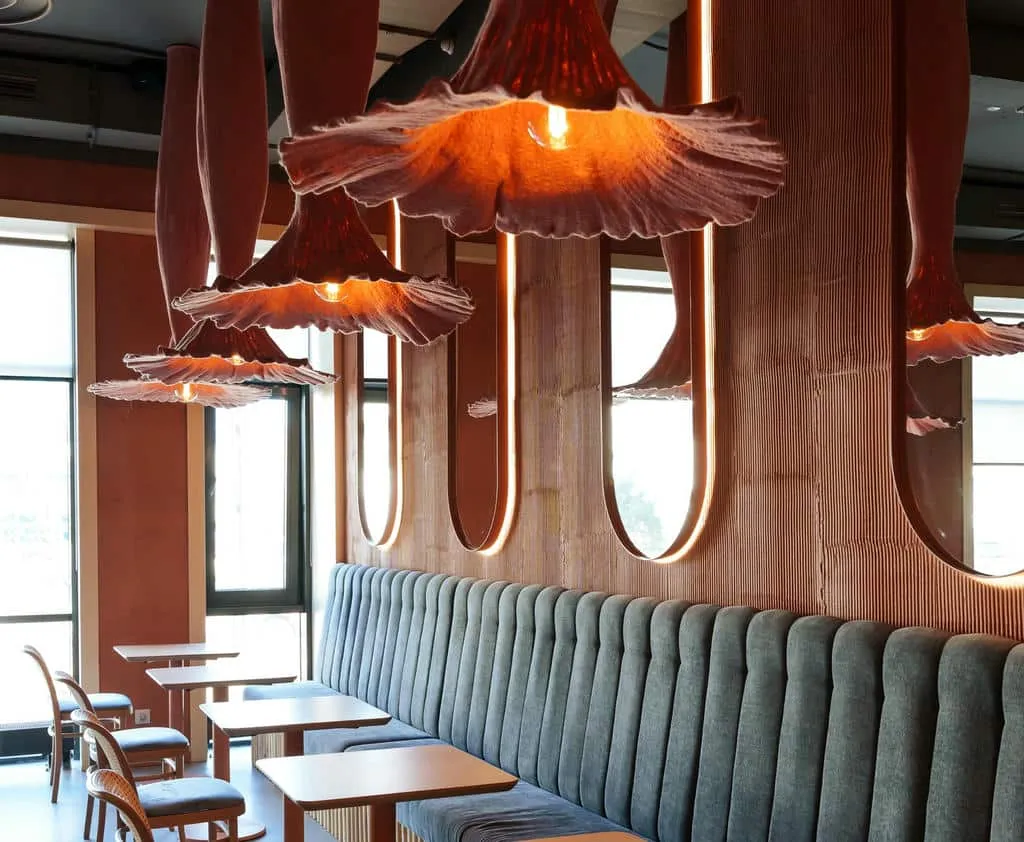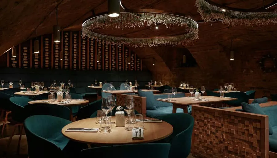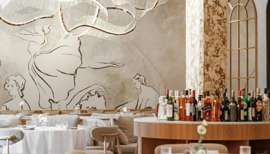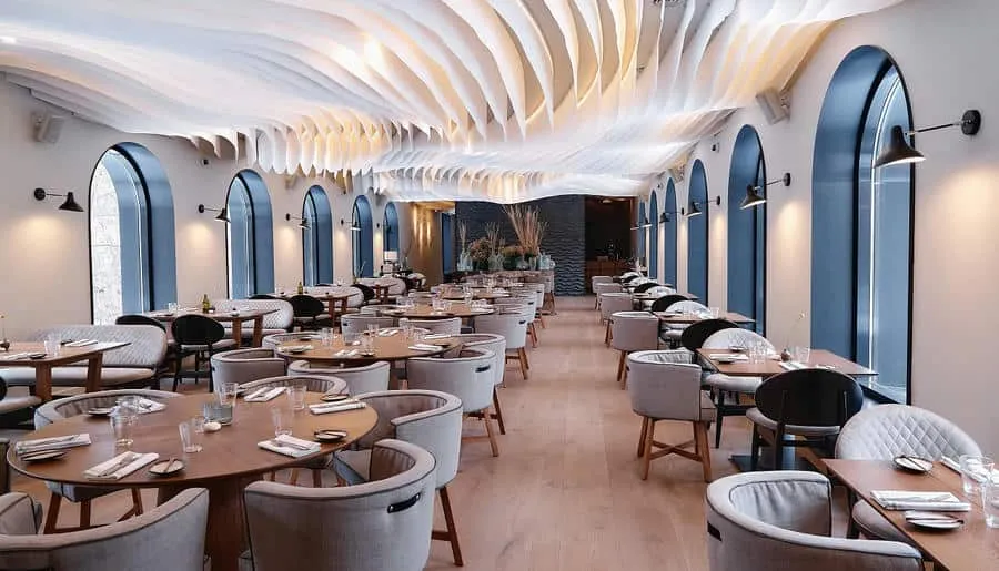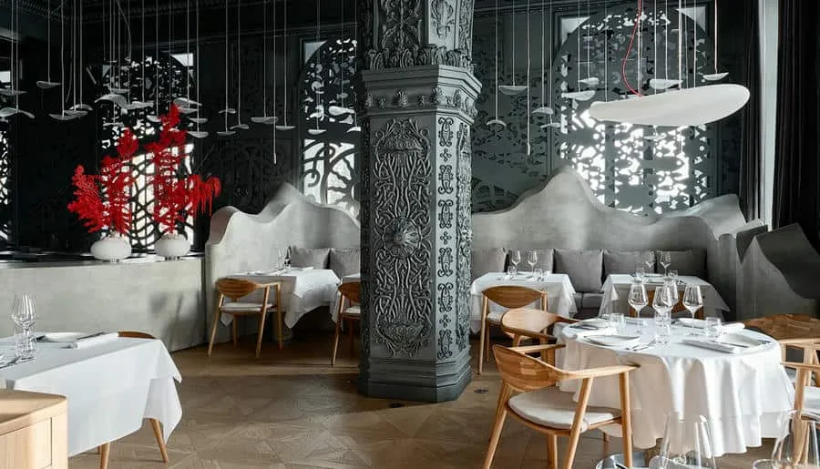 Интерьер сохранил исторические элементы здания — лепнину, сводчатые потолки и паркет. Дизайнеры добавили сказочные акценты: 200 стеклянных светильников-«медуз», керамические кораллы, бетонную волну, протянувшуюся через залы, и зеркальный грот в уборной, напоминающий дворец морского царя. Ресторан быстро стал культурной точкой притяжения: в 2024 году он получил награду за лучший интерьер в премии «Лучшие в индустрии».