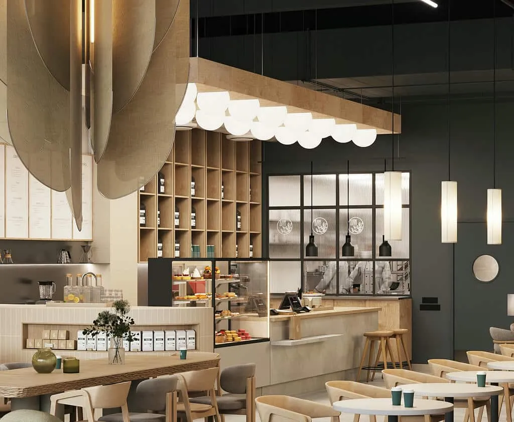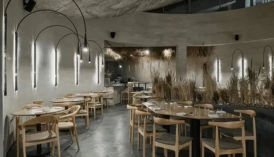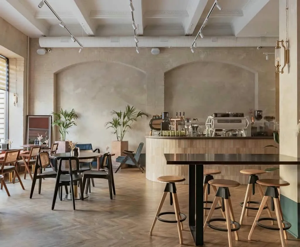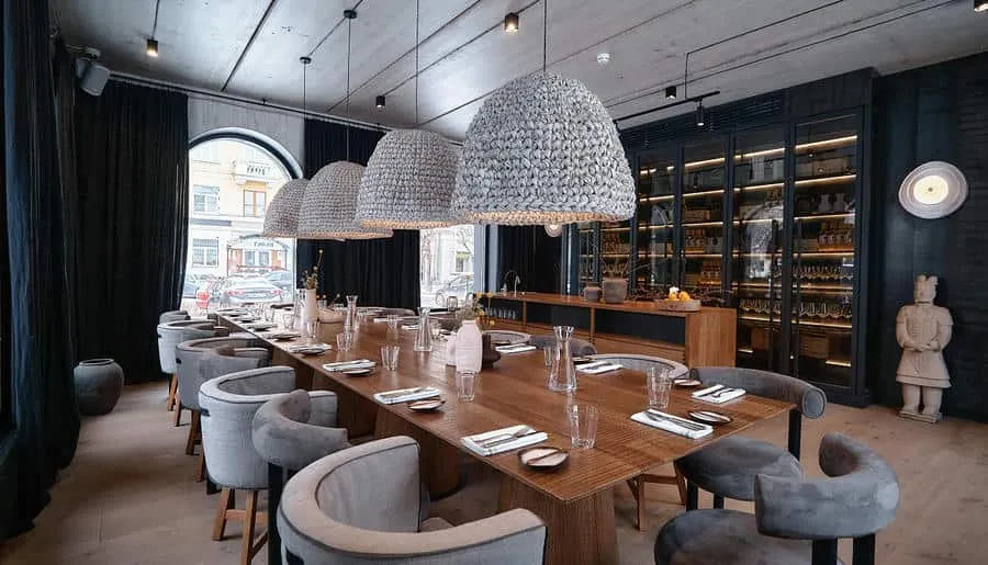 Интерьер выполнен в стиле софт-минимализма с панорамными окнами, текстурированными деревянными столами, абажурами «крупной вязки» и витринами с винными бутылками.