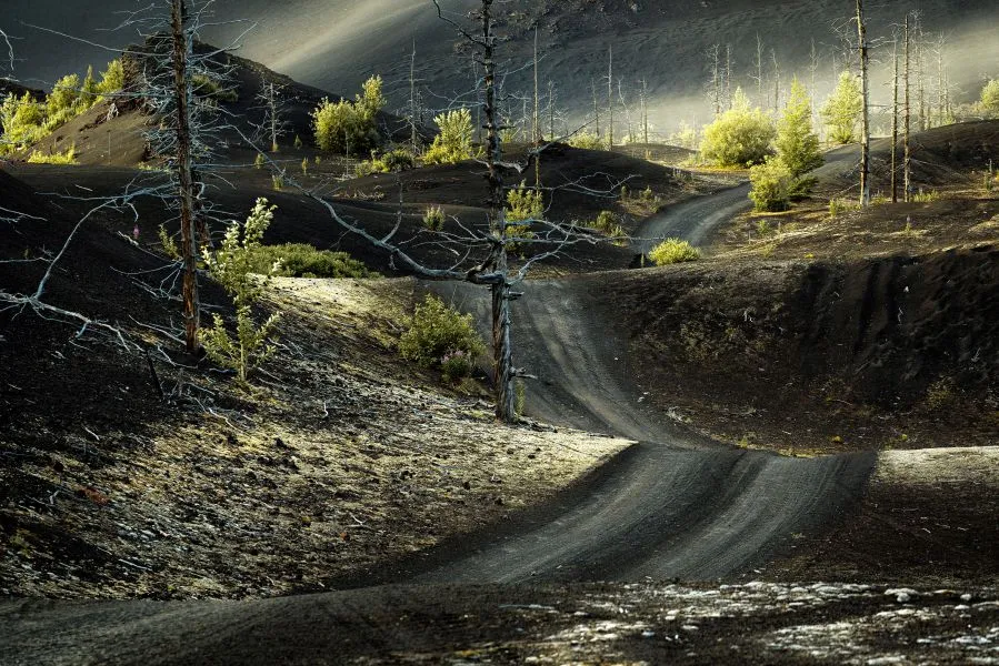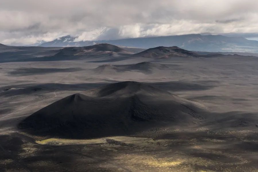 В 1975 году произошло самое мощное извержение вулкана Плоский Толбачик, которое продолжалось 1,5 года. Оно носит название БТТИ — Большое трещинное Толбачинское извержение. По мощности включено в топ-6 трещинных извержений на Земле. В результате него, вокруг вулкана Плоский Толбачик, образовались два прорыва через которые текла лава. Потоки лавы разлились почти на 50 км2 — можно сравнить с площадью Карловых Вар. Извержение послужило образованию десятка шлаковых конусов высотой до трехсот метров, сопровождалось молниями, огнями Эльма и смерчами. Тогда пепел покрыл толстым слоем все живое в округе. Природа не восстановилась до сих пор. А у подножия вулкана можно наблюдать безжизненную пустыню, которую назвали Мертвый лес. Вокруг нет ничего живого, только редкие кусты, трава и цветы, которые начали пробиваться спустя полвека после катастрофы. На фоне монохромного пейзажа они смотрятся особенно контрастно.