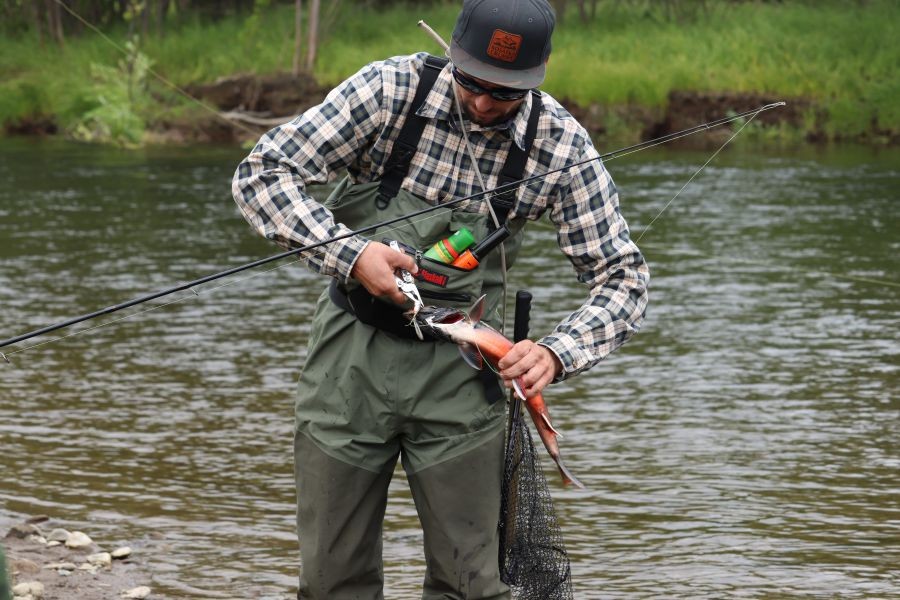Акватория реки разнообразна: перекаты, омуты, стремнины, плесы и протоки. Есть широкие места с тихой водой и места сужения с быстрым потоком. Ловят лососевых нахлыстом и на спиннинг. Все необходимые рыболовные снасти мы предоставляем на месте. Вывоз рыбы с реки запрещен, ловля по принципу «поймал-отпустил».