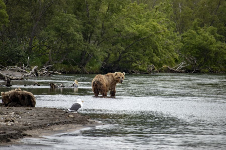 Медведи — главная фишка этого места. 250 бурых медведей лакомятся неркой в озере в середине лета, когда около шести миллионов особей заходят на нерест. Это крупнейшая нерестовая миграция Евразии. С середины июля рыба начинает подниматься из Охотского моря по реке Озерной, единственной вытекающей из Курильского озера. На истоке реки работает стационар научно-исследовательского института рыбного хозяйства и океанографии.
