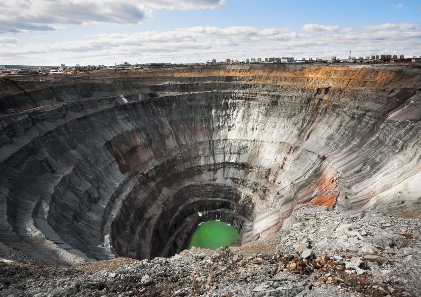 В 814 километрах по прямой от Якутска расположен город Мирный — алмазная столица России. Самолетом доберетесь за 2 часа 15 минут. Здесь находится знаменитая гигантская дыра в земле — кимберлитовая трубка «Мир». Ее диаметр 1200 метров, а глубина 525 метров. До 2001 года добыча алмазов проходила открытым способом. За это время из-под земли удалось достать камней на 17 миллиардов долларов. В 2009 году был открыт подземный рудник «Мир», который закрыли через восемь лет из-за произошедшей на нем аварии. Компания «Алроса» перешла на добычу алмазов в другую кимберлитовую трубку — «Удачная». А «Мир» остался главной достопримечательностью города, которую видно даже из космоса.