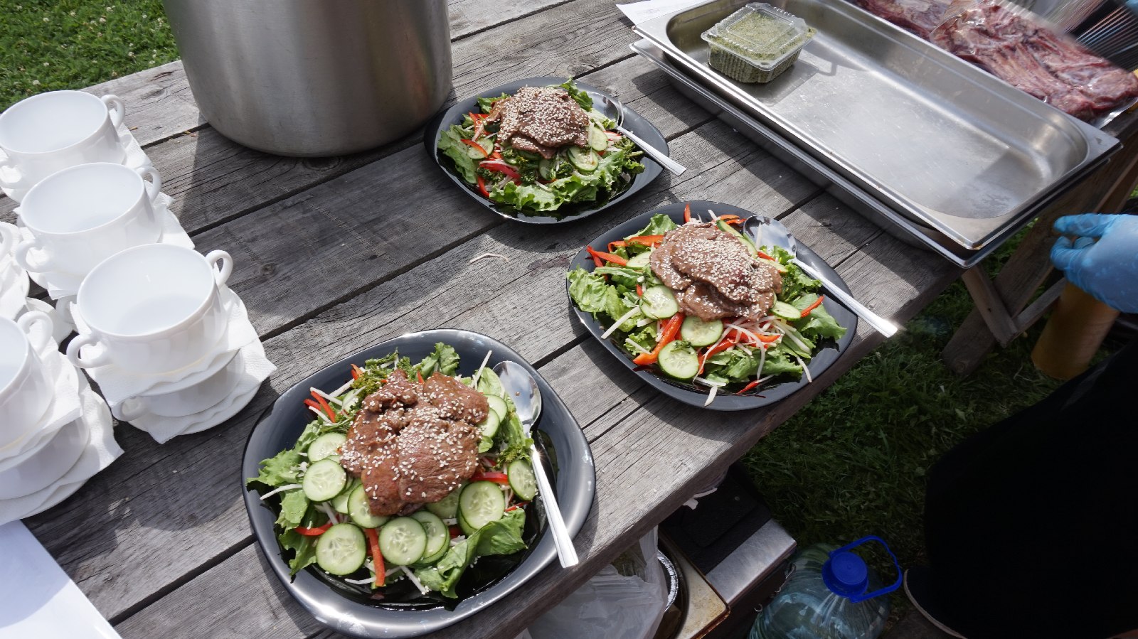 Our first gastro tour lasted 12 days. The guests changed 9 locations and tried the kitchen from 3 different chefs. A total of 112 dishes and snacks, accompanied by 32 drinks. We cooked in the taiga, arranged a culinary masterclass, got food by SUVs, on water and by helicopter. Because of the lightning that hit the transformer, we were left without a refrigerator and electric stoves. In the intervals between changes of dishes, we went up to the mountains, floated on a mountain river, rode jet skis and steamed in the bath.