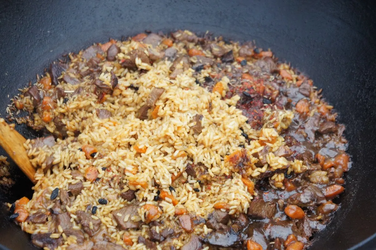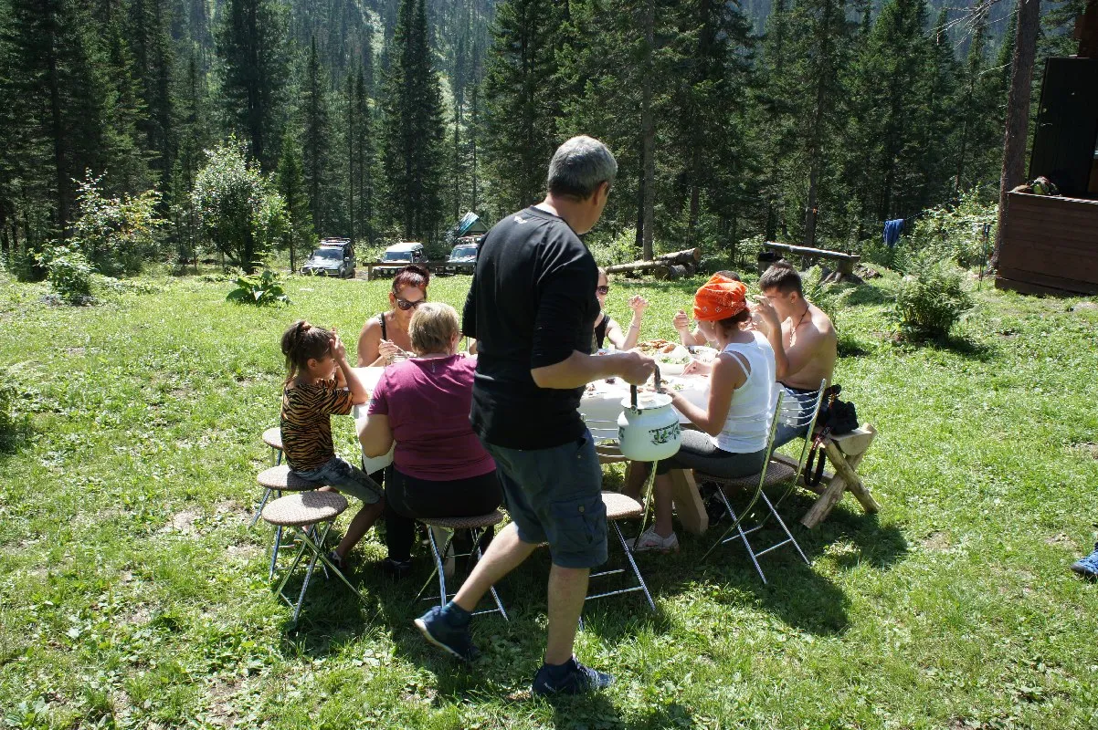 For a picnic, we chose a place on the bank of the river, where they could swim, sunbathe and fish. While the guests were resting, the guides cooked lunch. In the evening, guests were taken to the hotel. For dinner chefs cooked pilaf and learn how to drink homemade samogon.